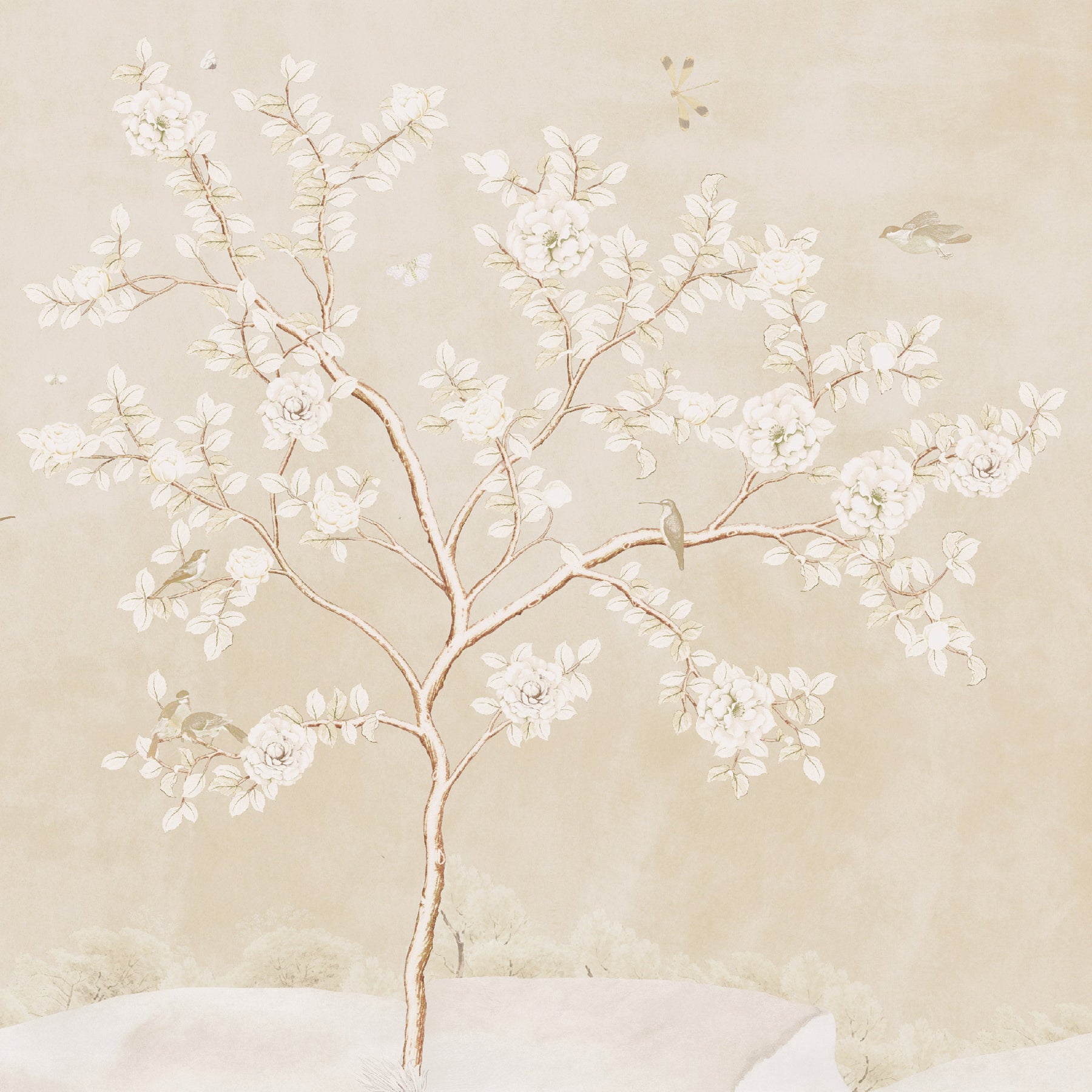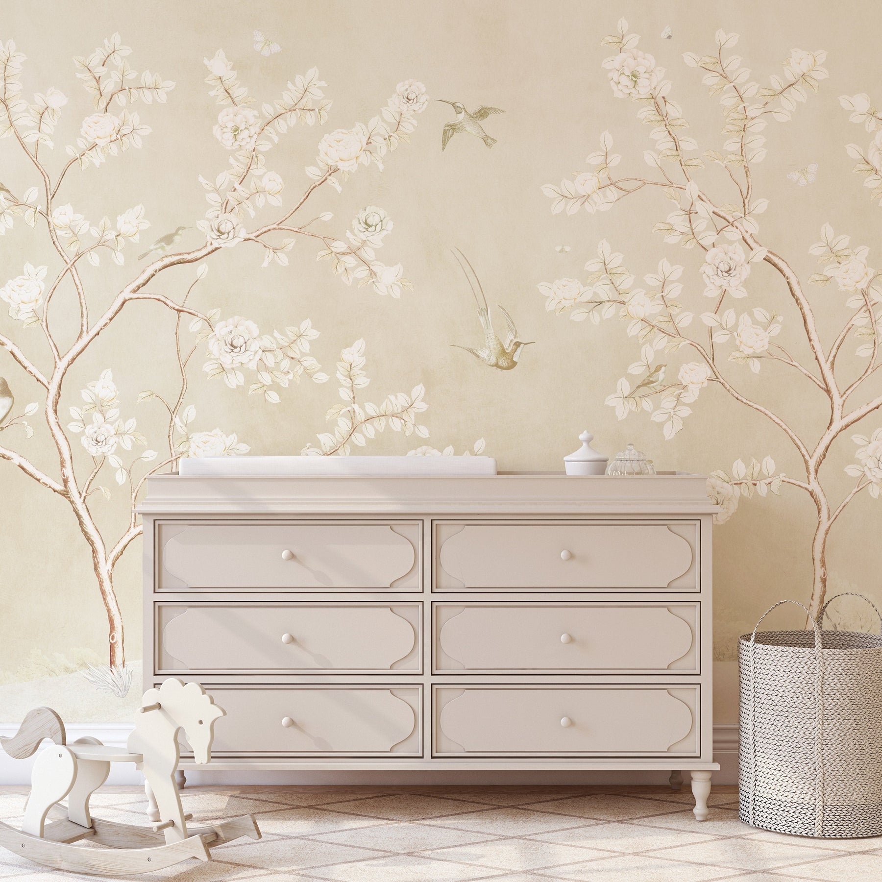 A delightful garden of hand-drawn white peonies, sweet birds, dragonflies, and butterflies on a faux textured pale gold background. A pretty mural that will bring a warm feminine touch to any space. You can also order this design as panels. We will resize the artwork to fit your panel sizes.