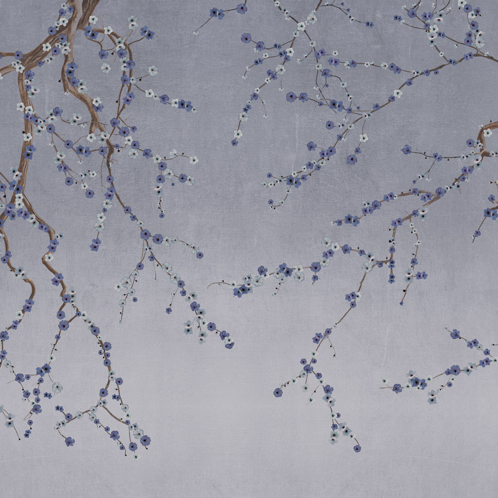 Delicate blue and white blossoms on twisty, ancient branches on a grungy indigo blue background.