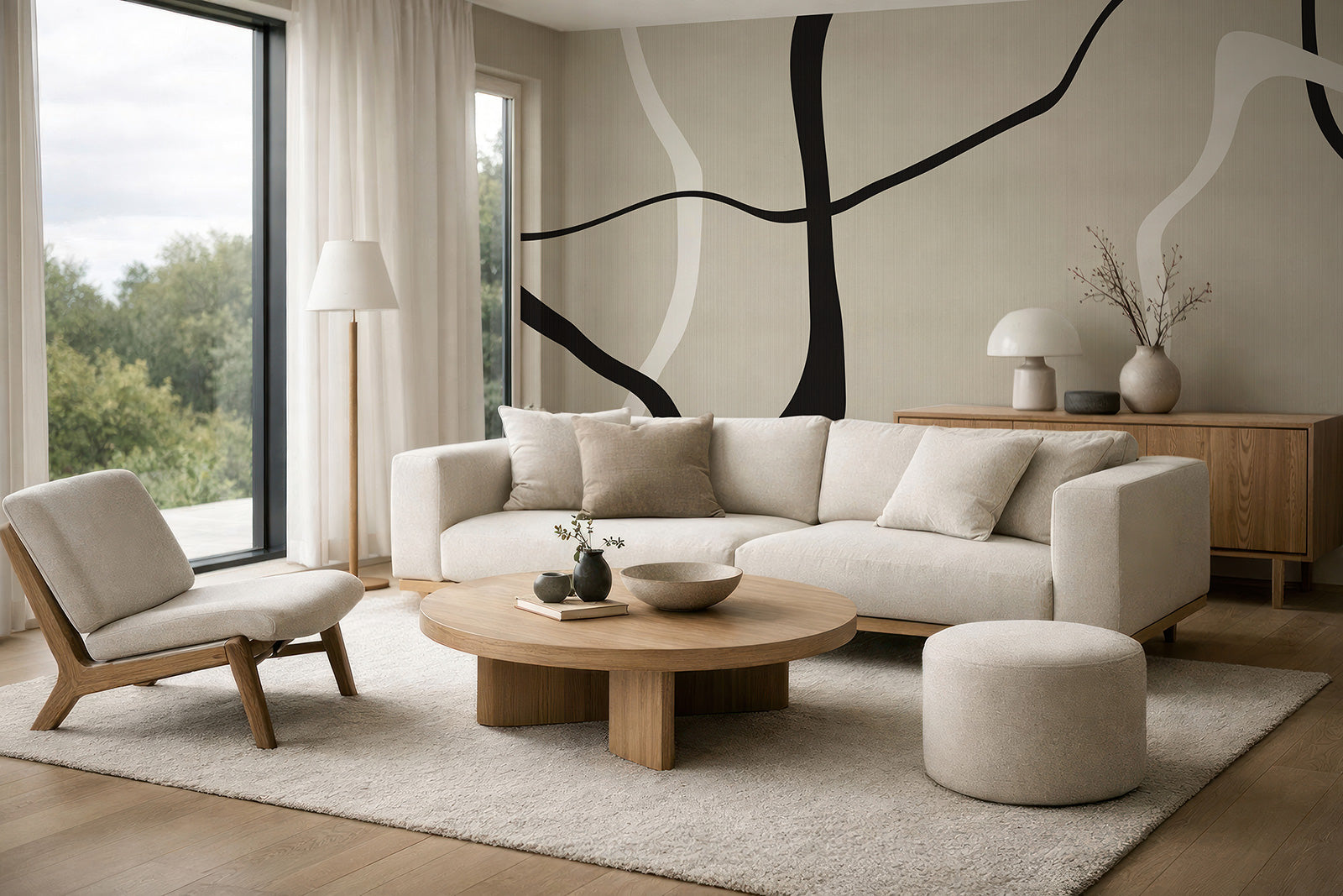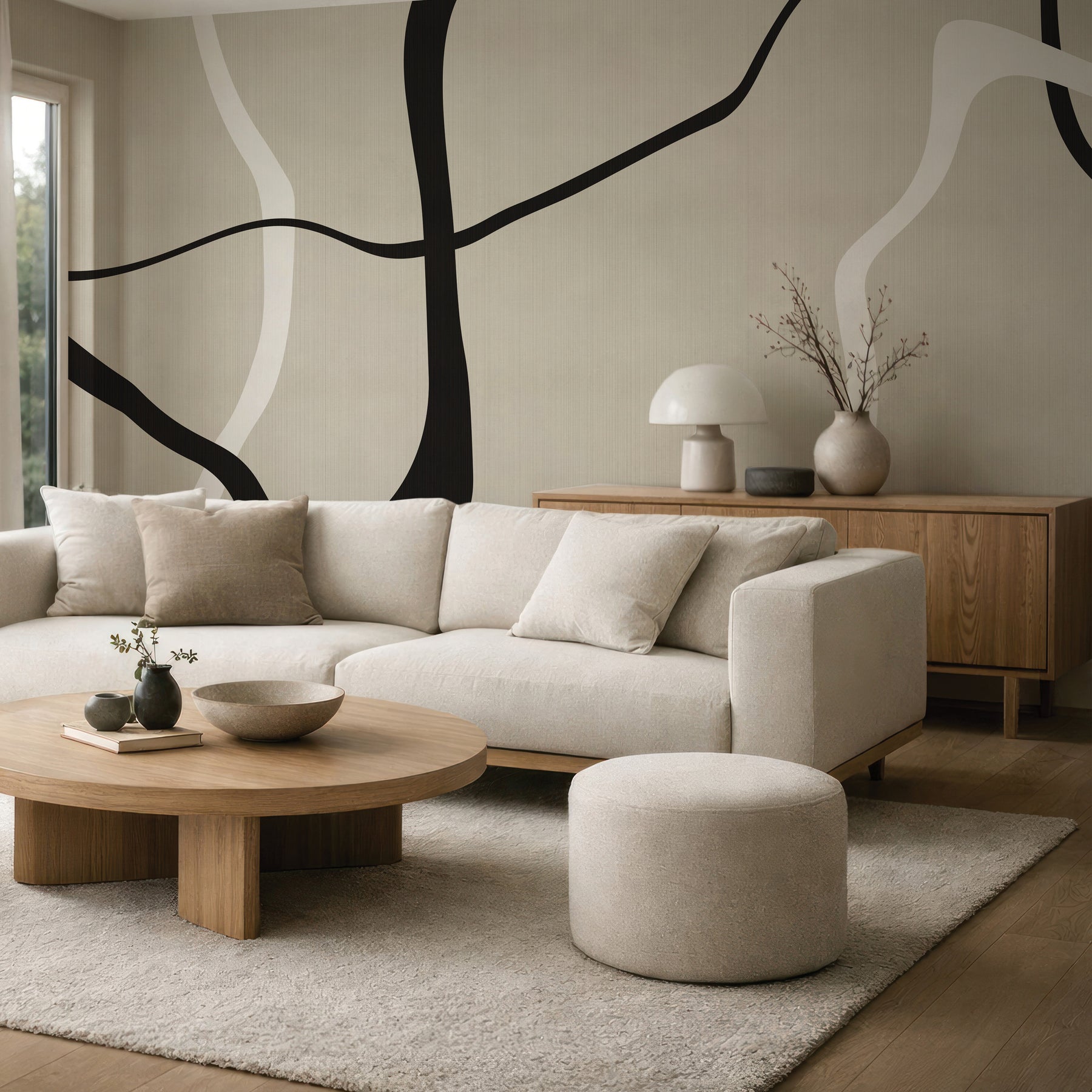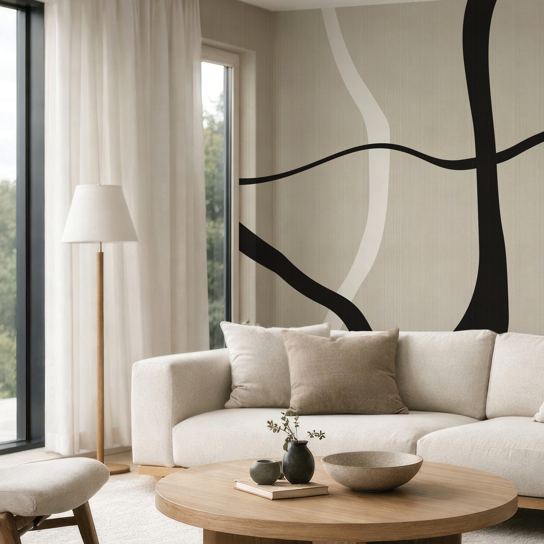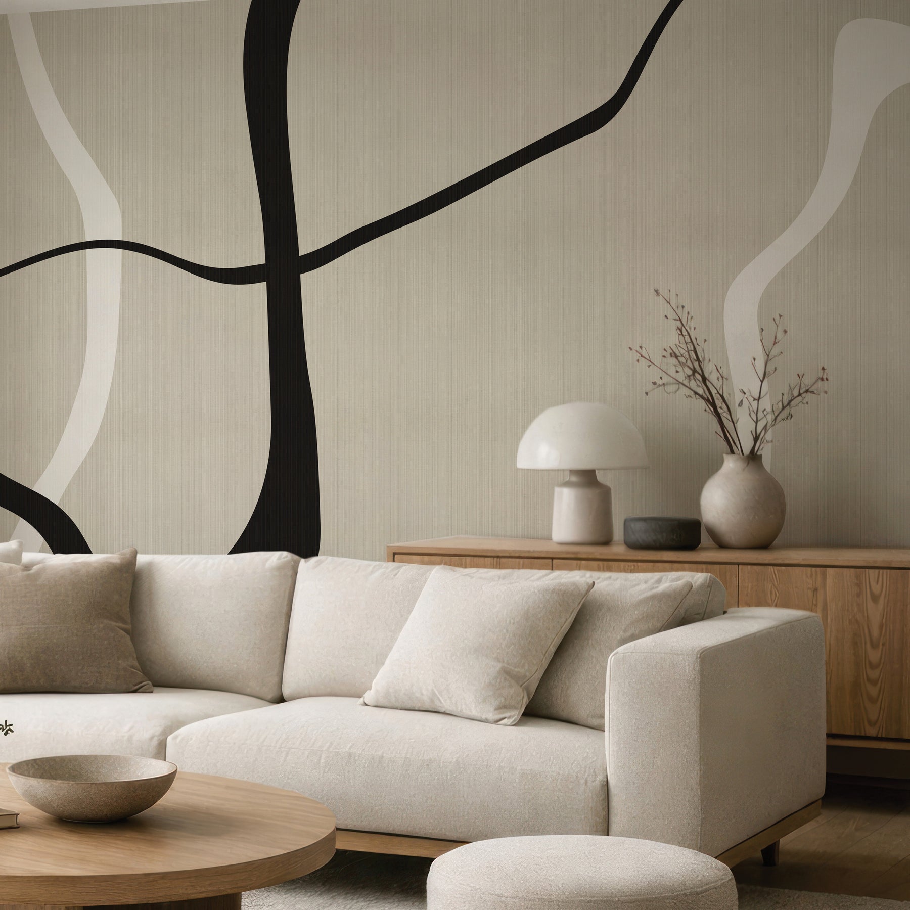 Dramatic black and white lines organically flowing over a creamy faux-woven texture.