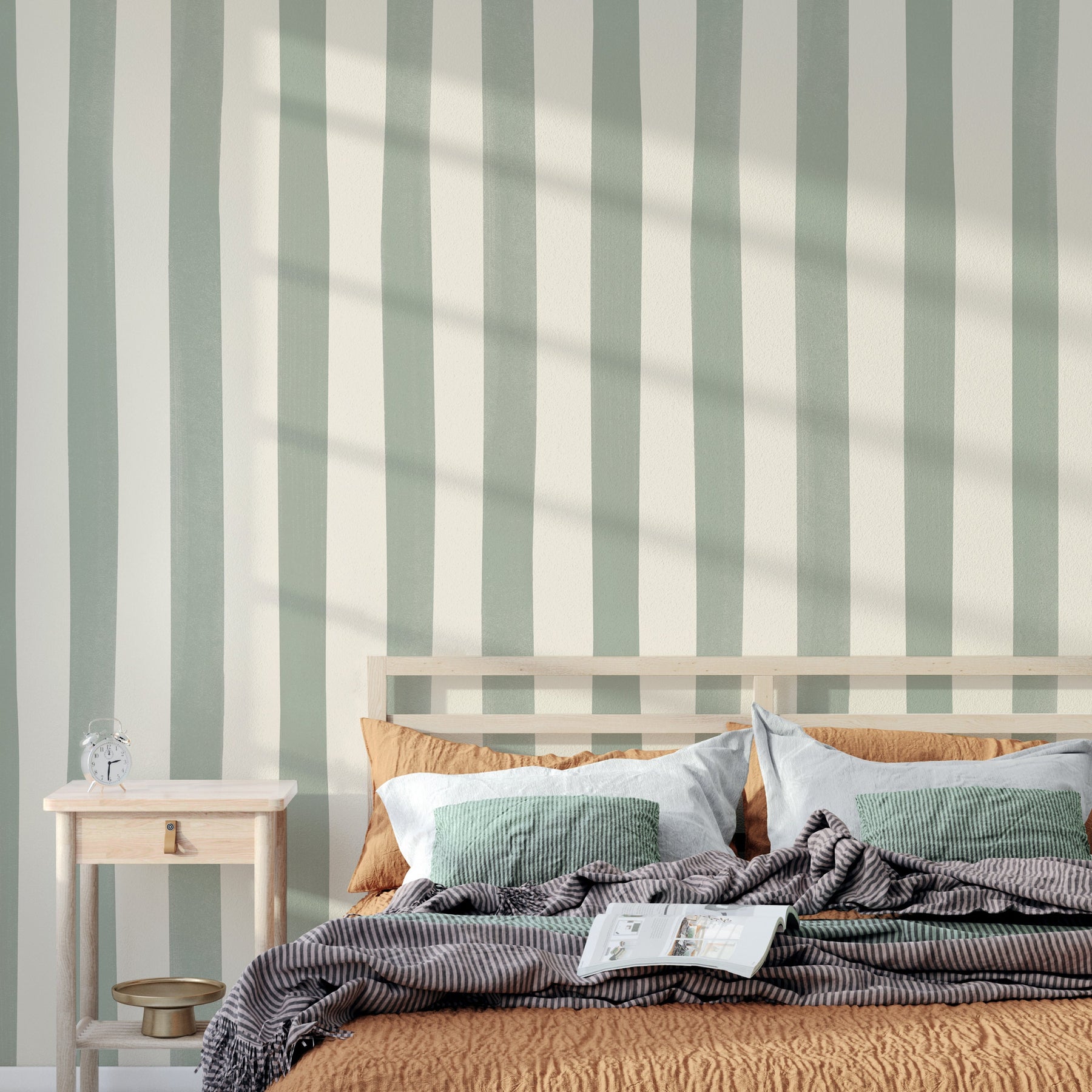 Bold and beautiful watercolour stripes in sage on a soft cream background. Each stripe is approximately 9cm wide.