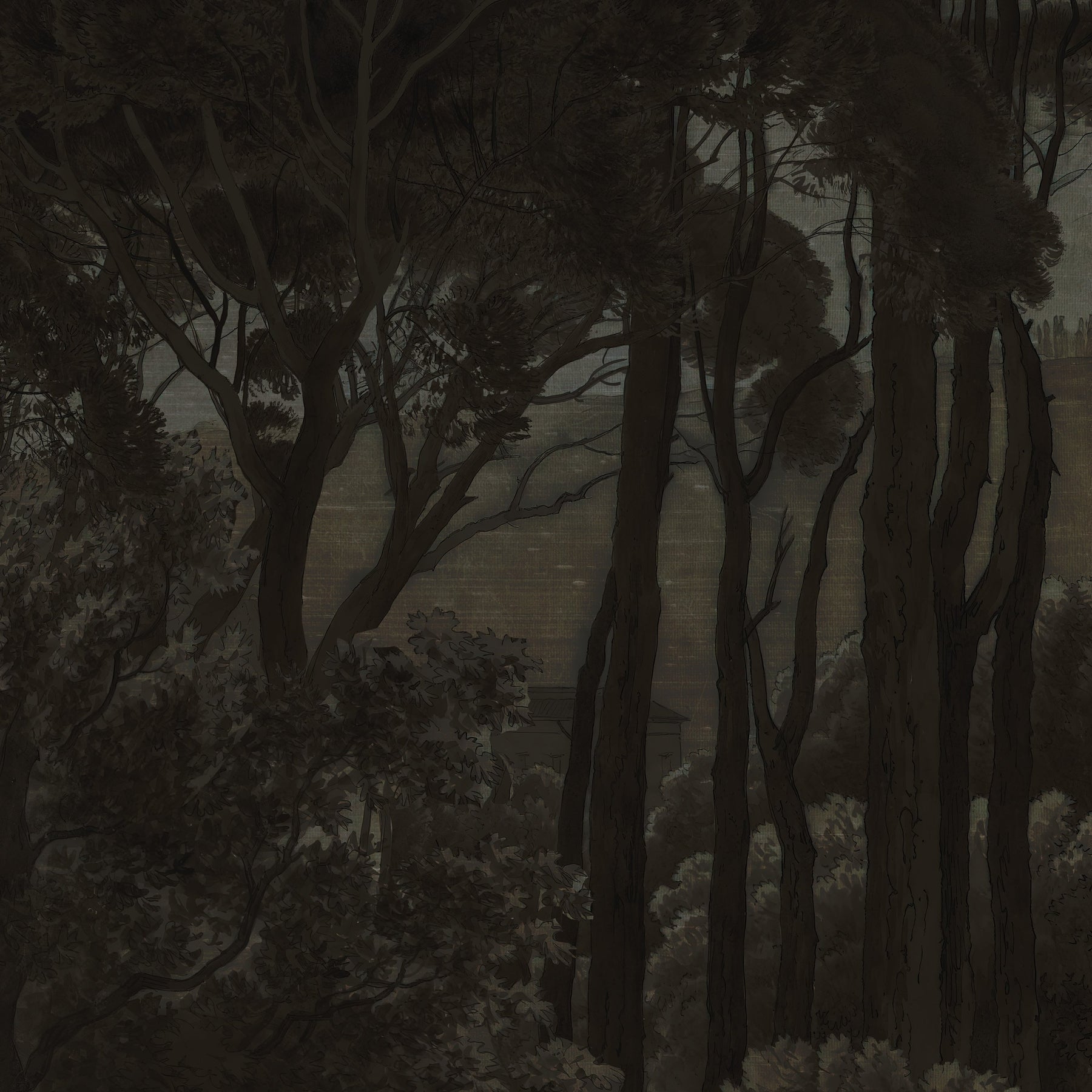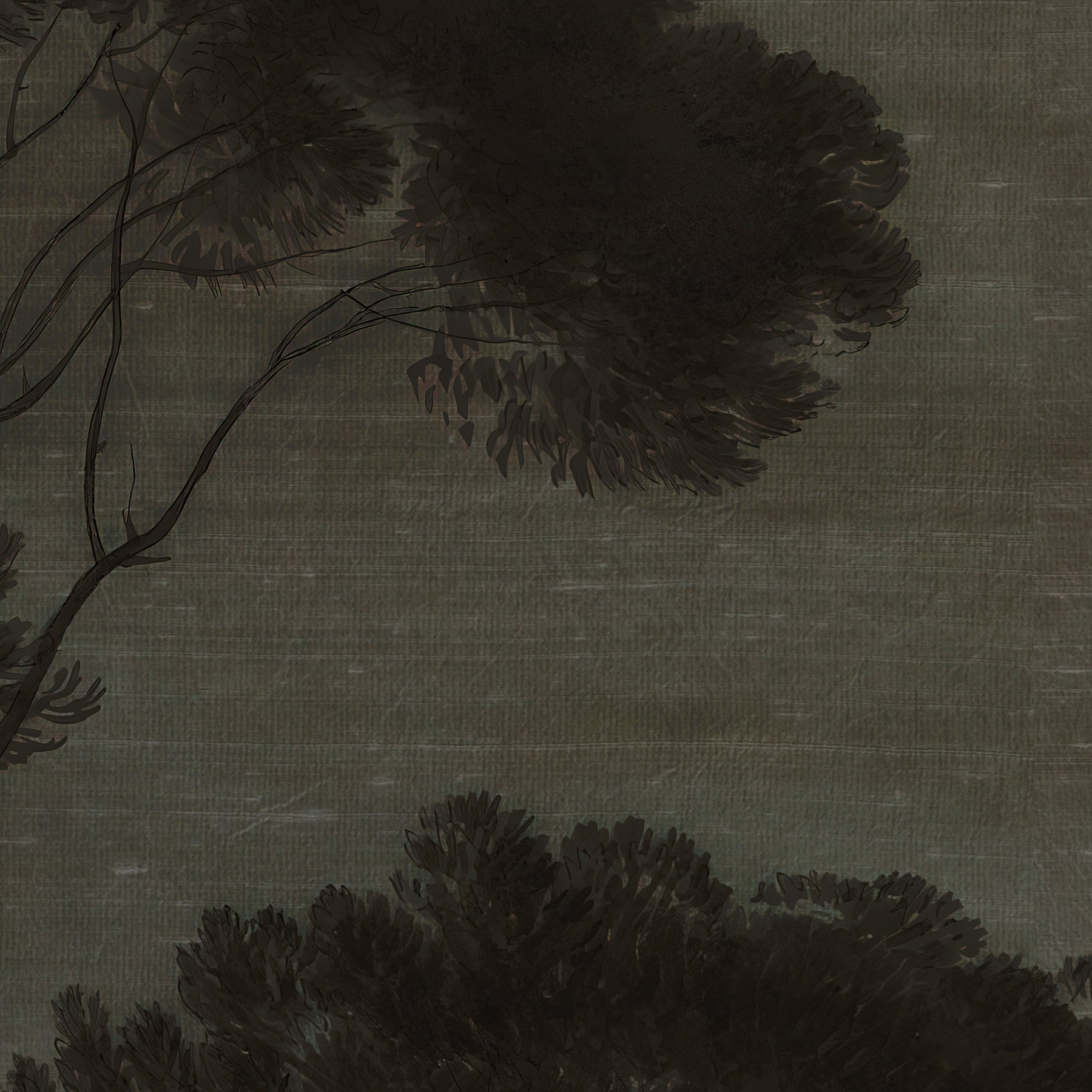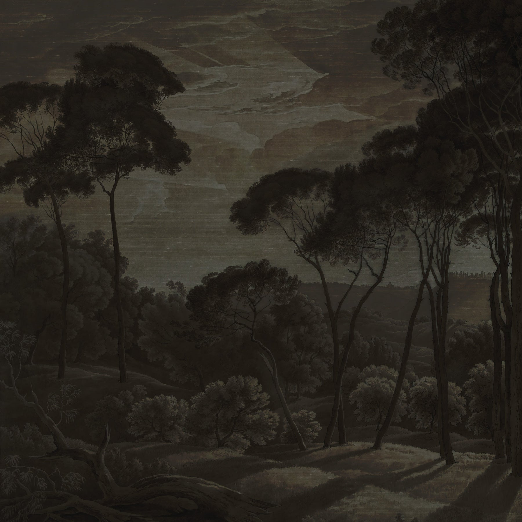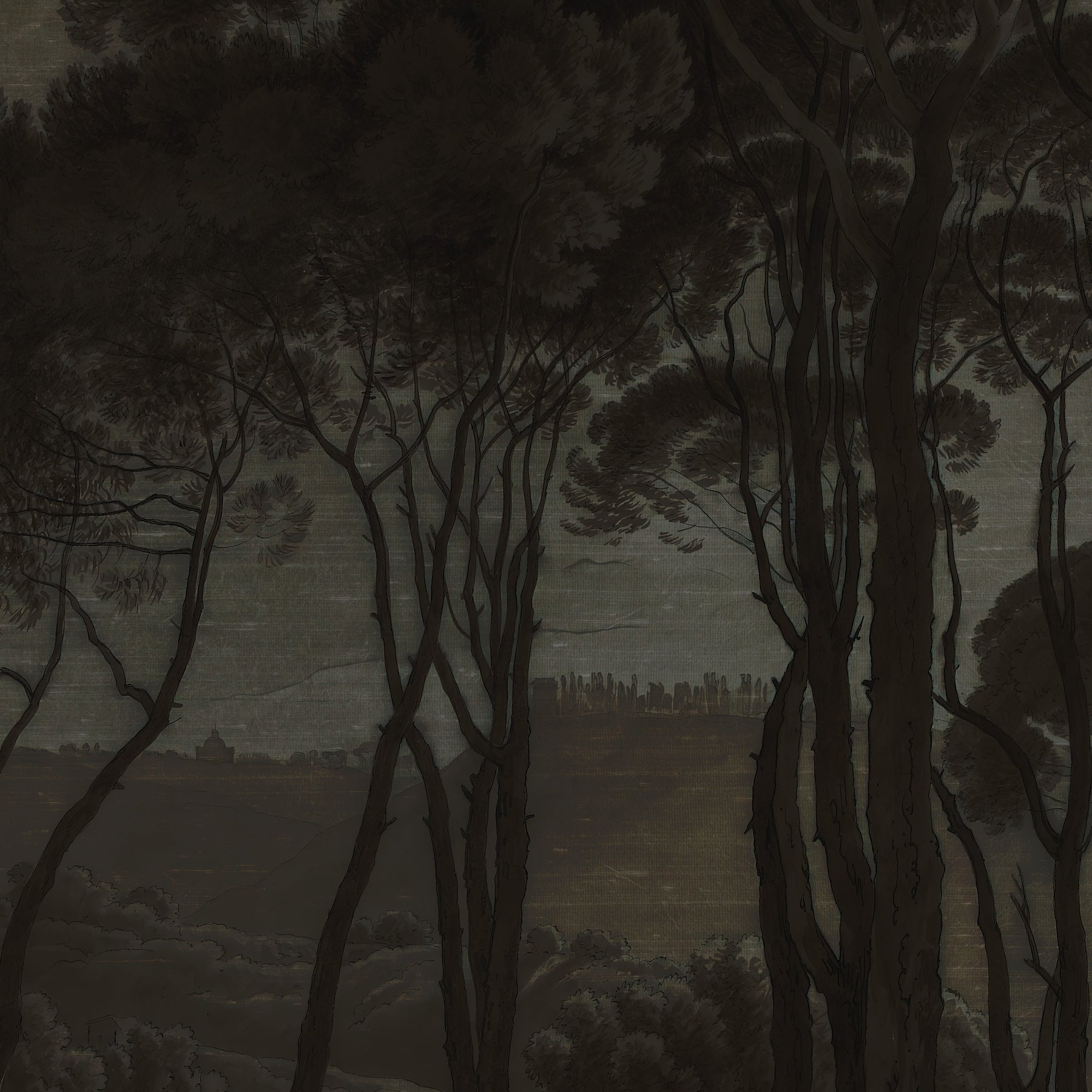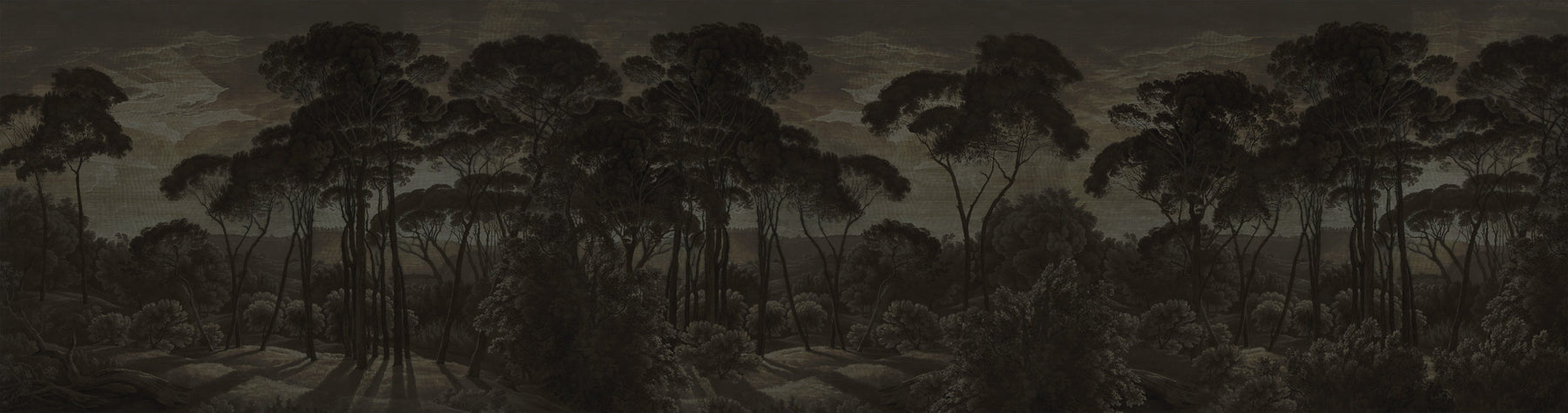 A dark and moody vintage landscape study of Mediterranean umbrella pines at twilight. This mural design has a delicate raw silk fabric effect subtly blended into the artwork to create the illusion of texture.