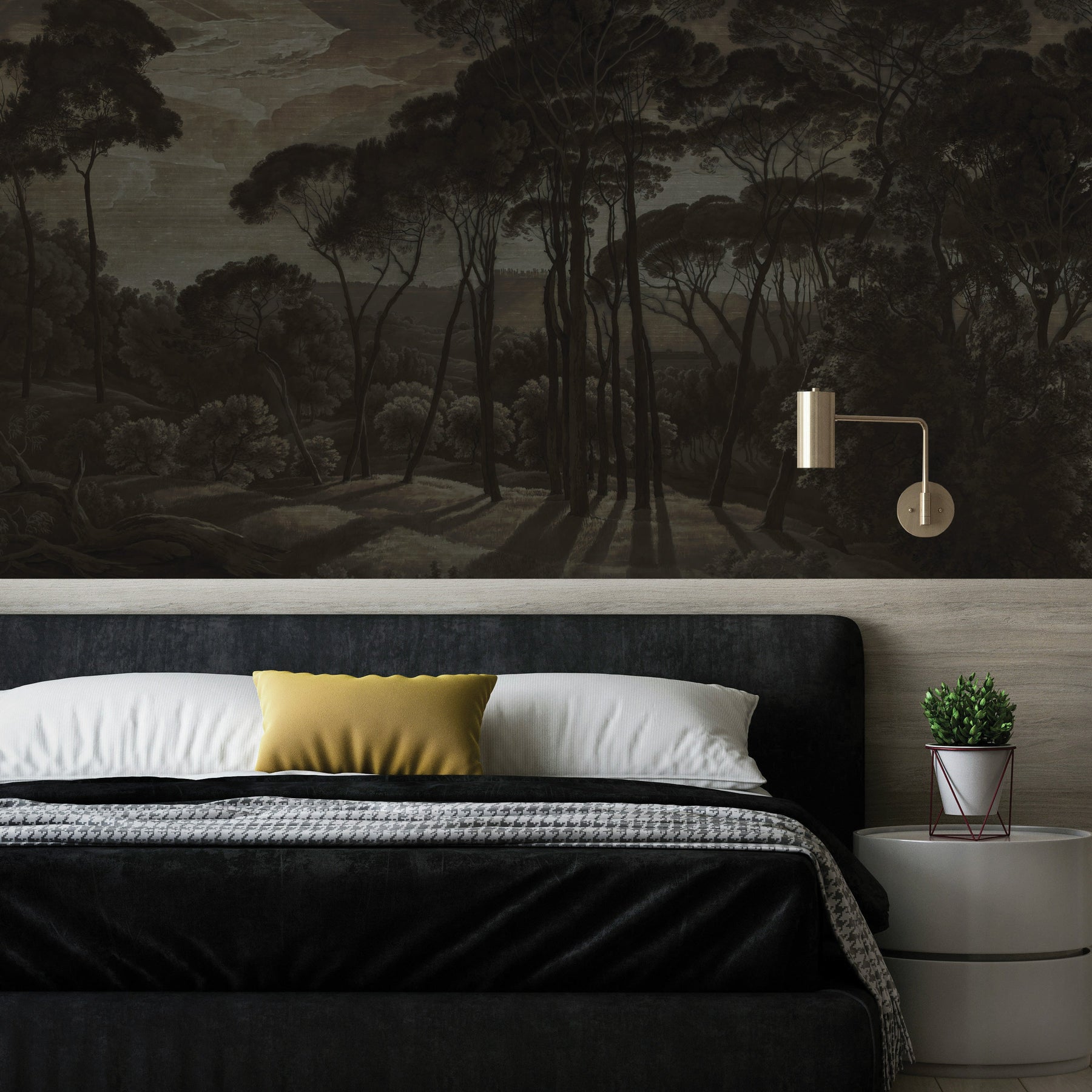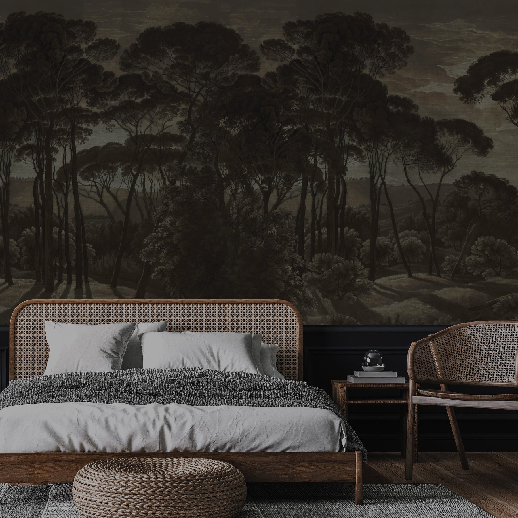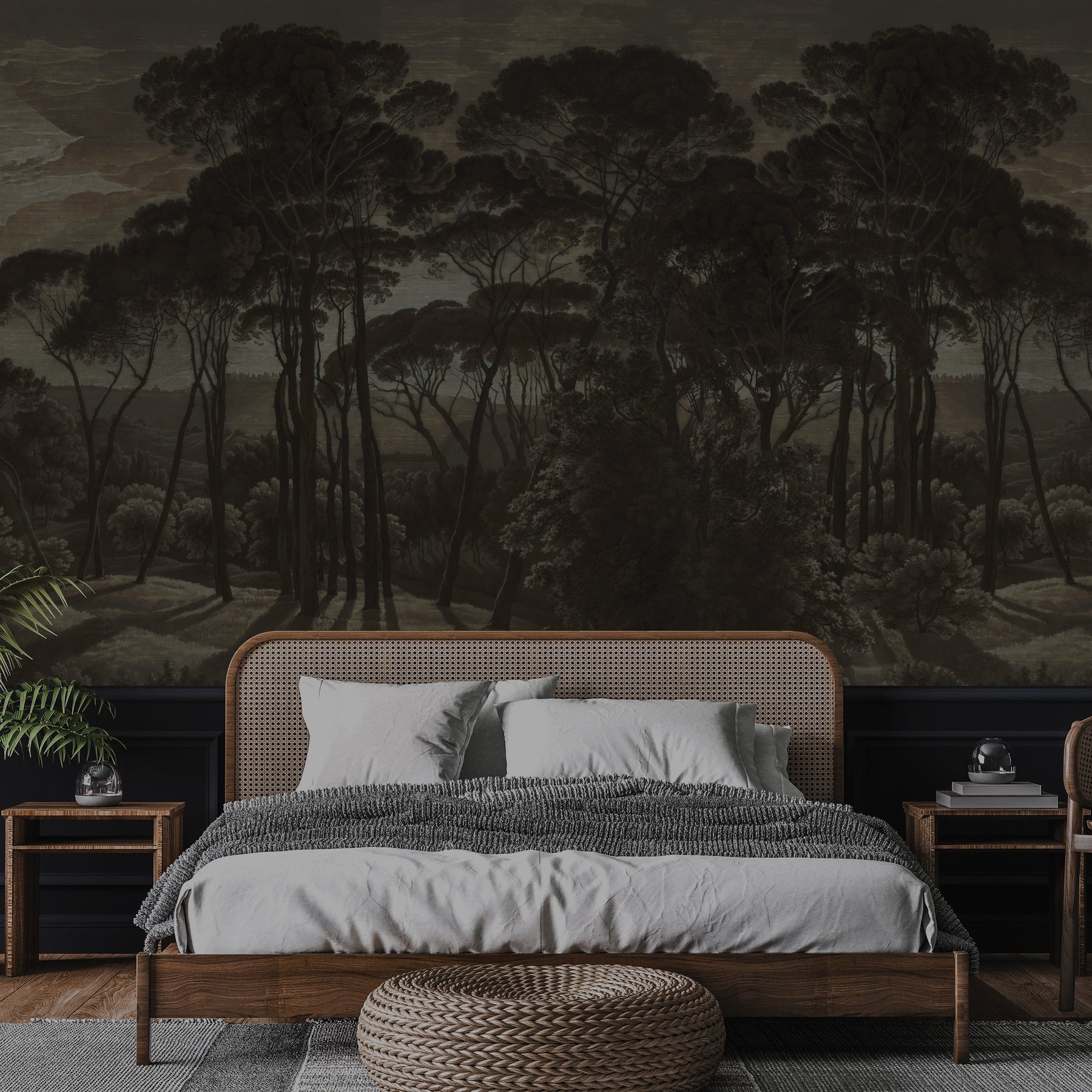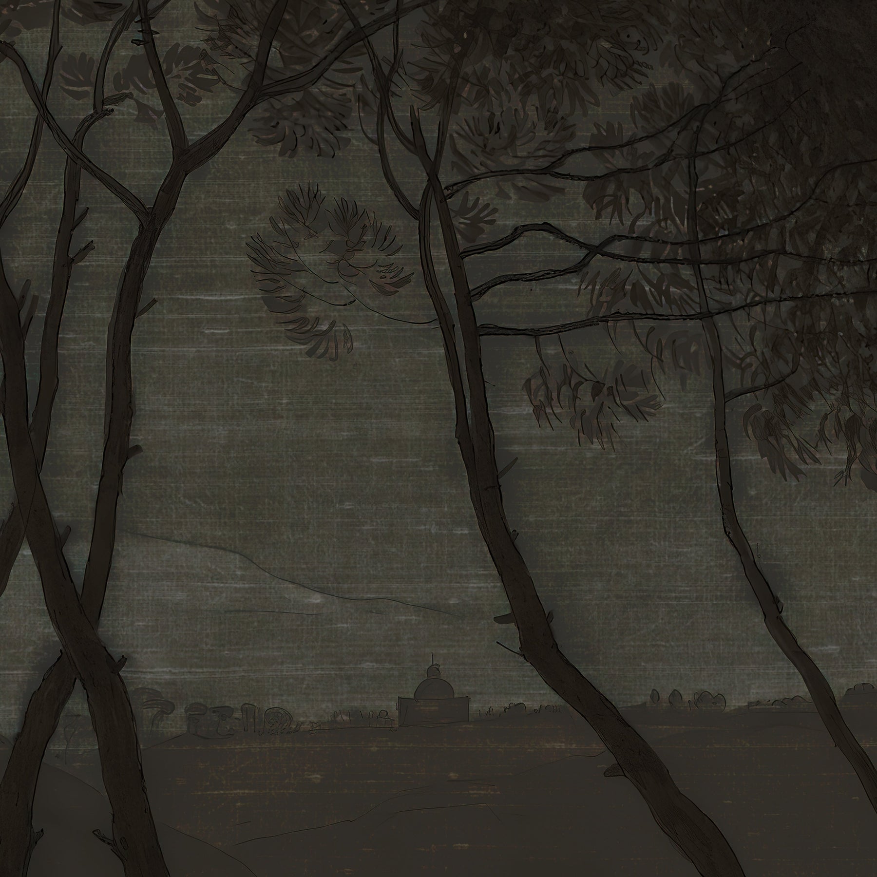 A dark and moody vintage landscape study of Mediterranean umbrella pines at twilight. This mural design has a delicate raw silk fabric effect subtly blended into the artwork to create the illusion of texture.