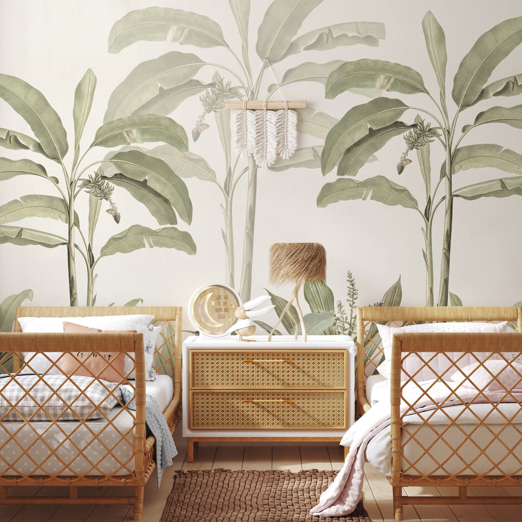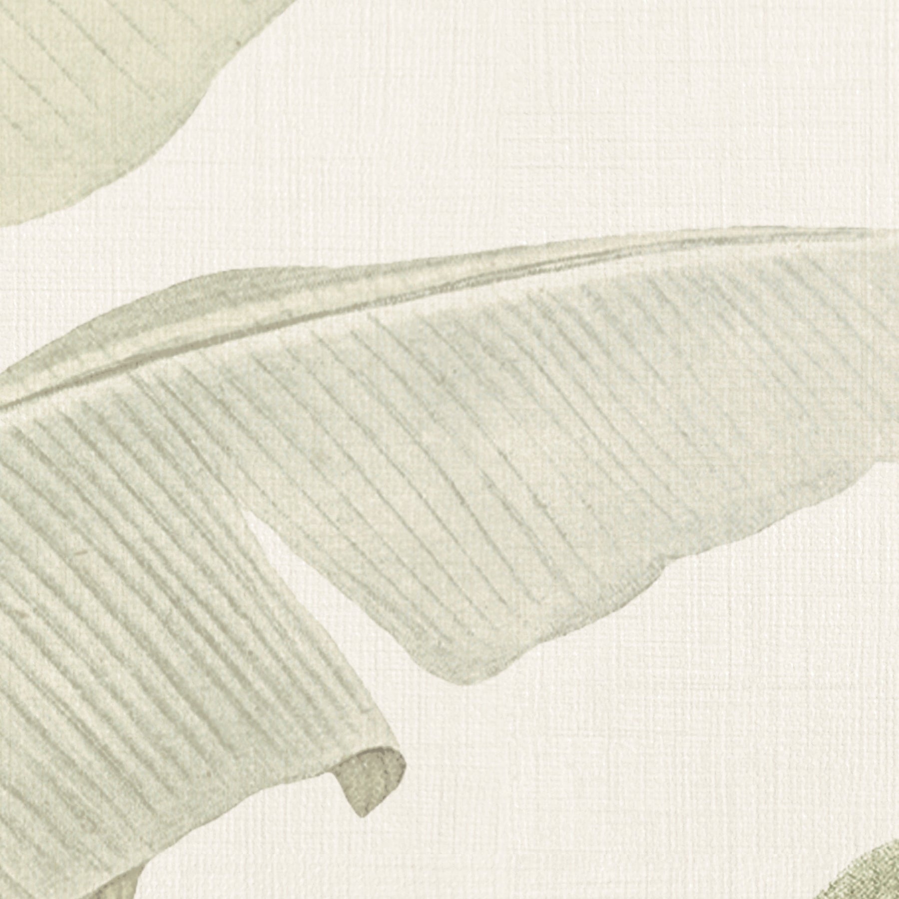 An arrangement of faded vintage leaves and plants in soft sage greens, imposed onto a creamy off white linen texture. Each lush plant is hand drawn and adapted from 19th century artworks featuring large banana trees, arecanut palm plants and cordyline fruticosa. Due to the size and style of the vintage artworks, the plants in this design have a soft, grainy texture.