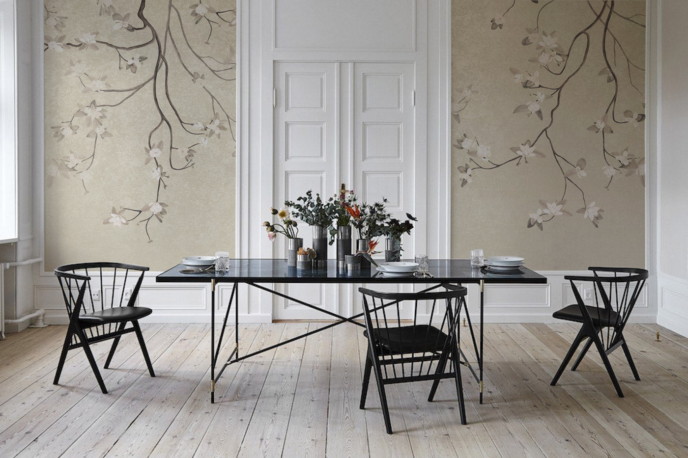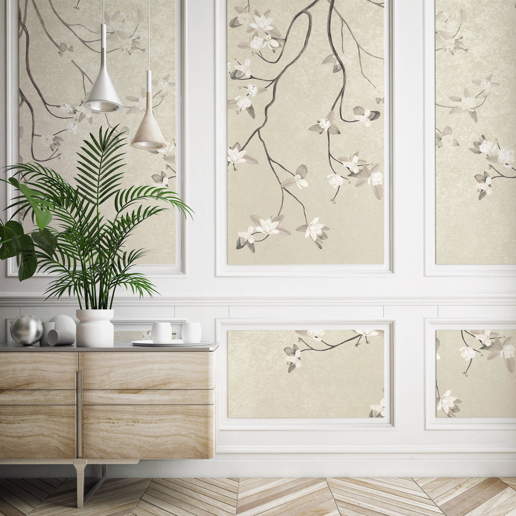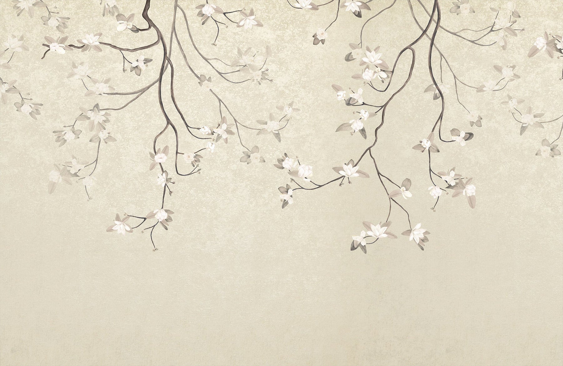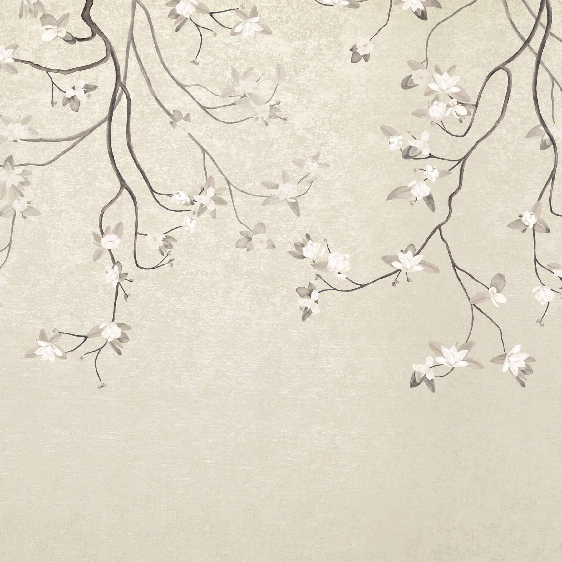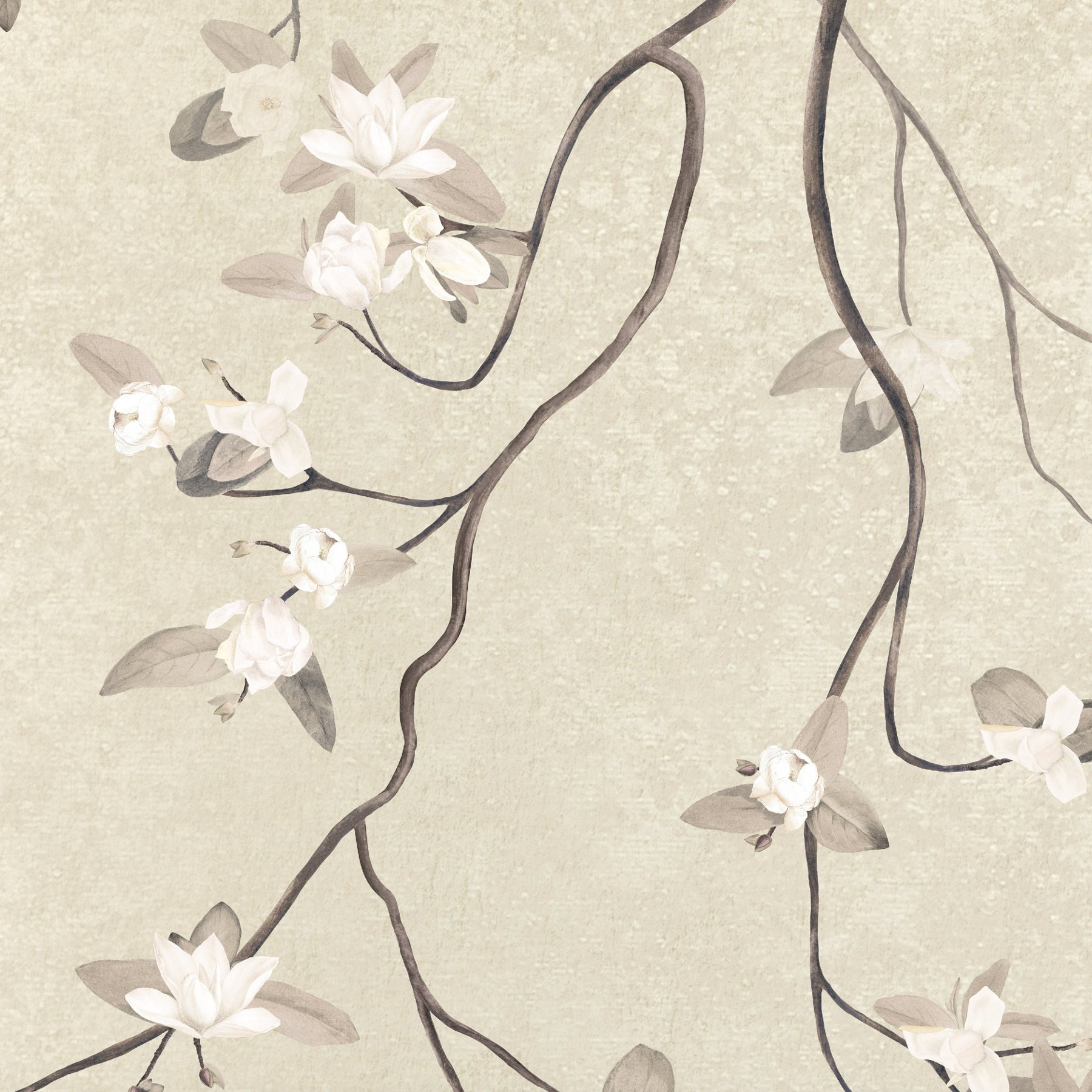 Elegant creamy white magnolias with taupe leaves on smooth, curvy branches, cascading across a subtle, iridescant background of pale gold*.