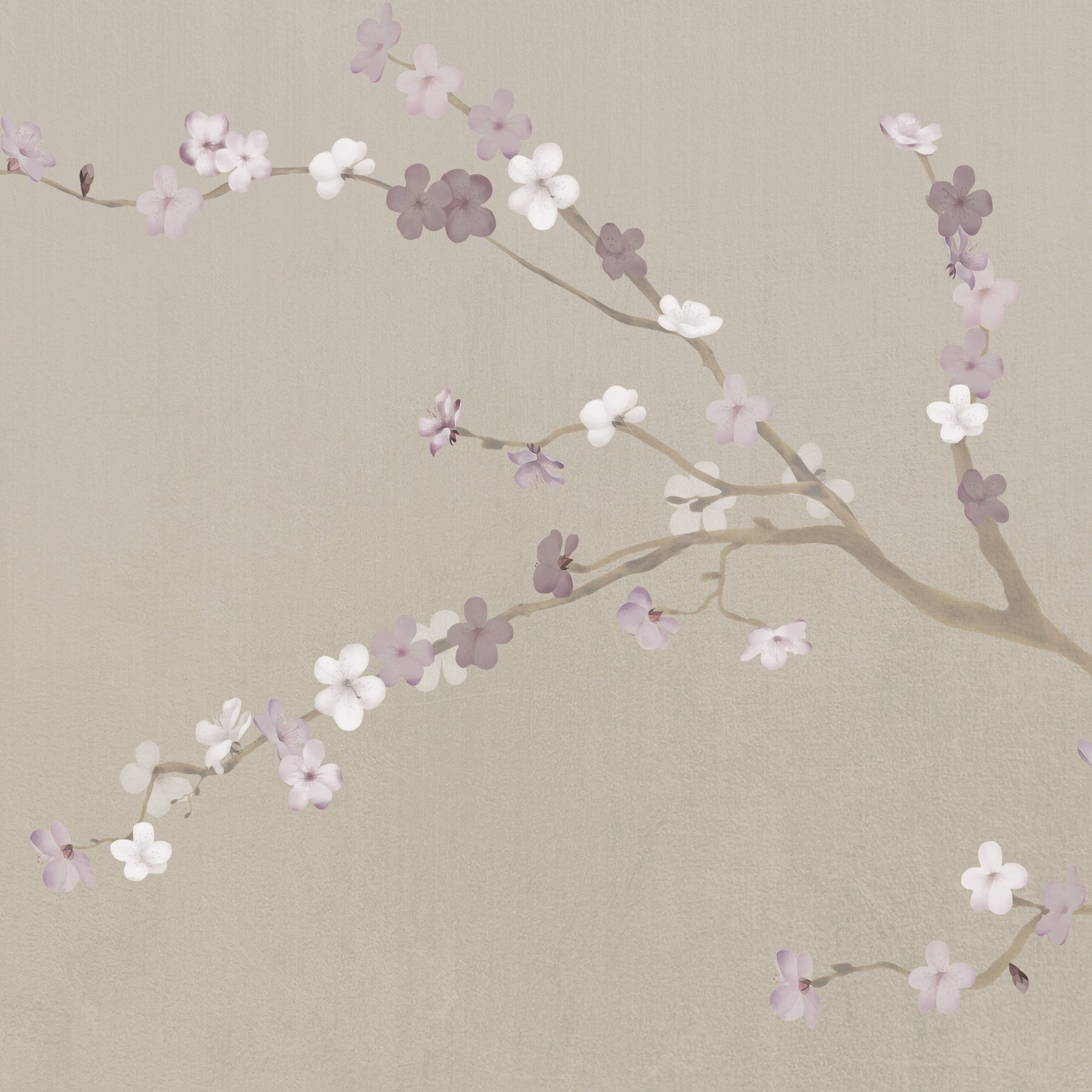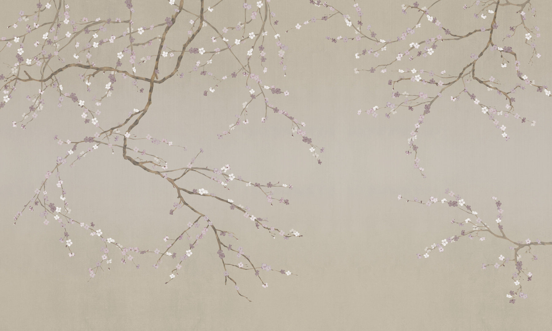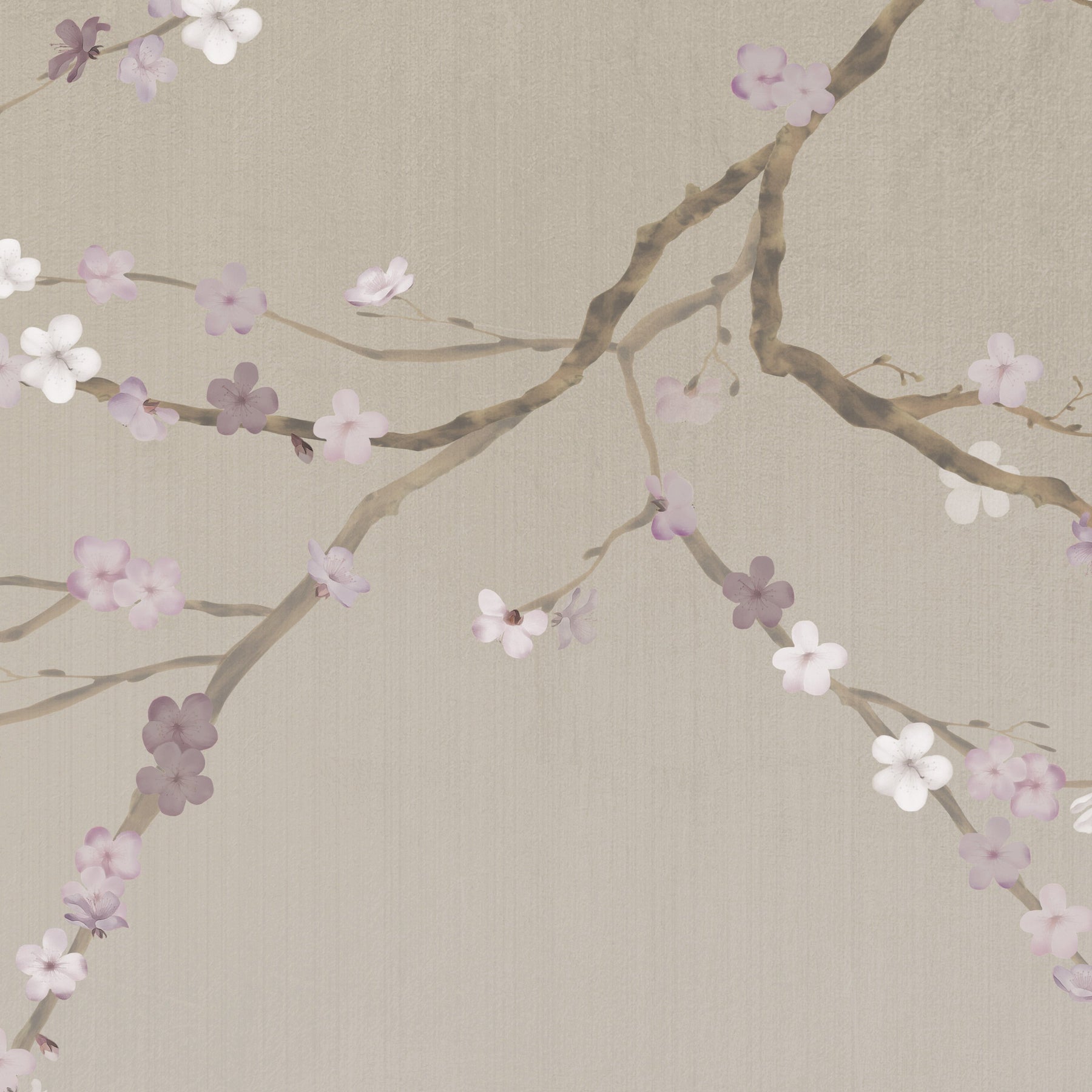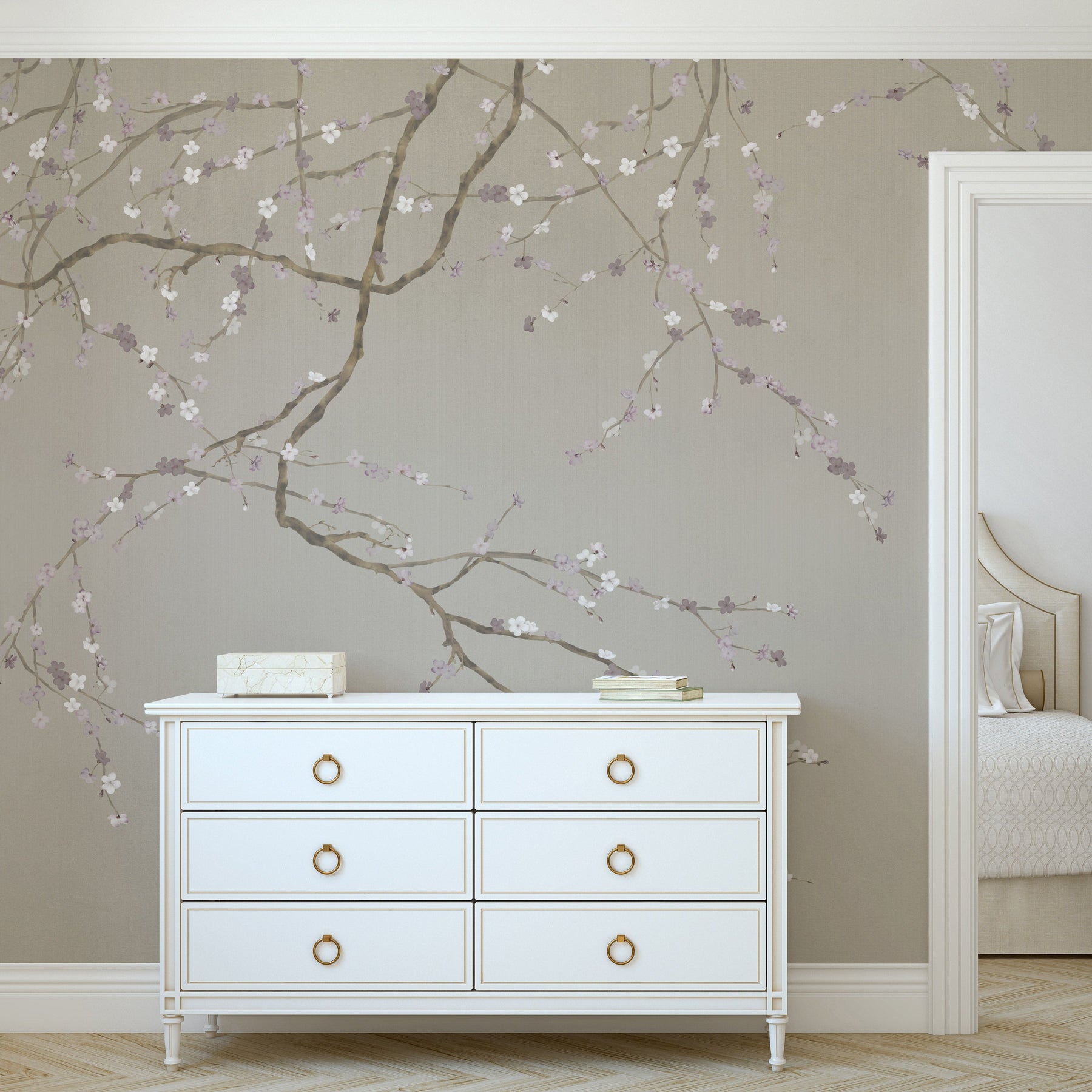 A pretty mural of violet and white blossoms delicately hanging on twisty, bended branches on a soft taupe background.