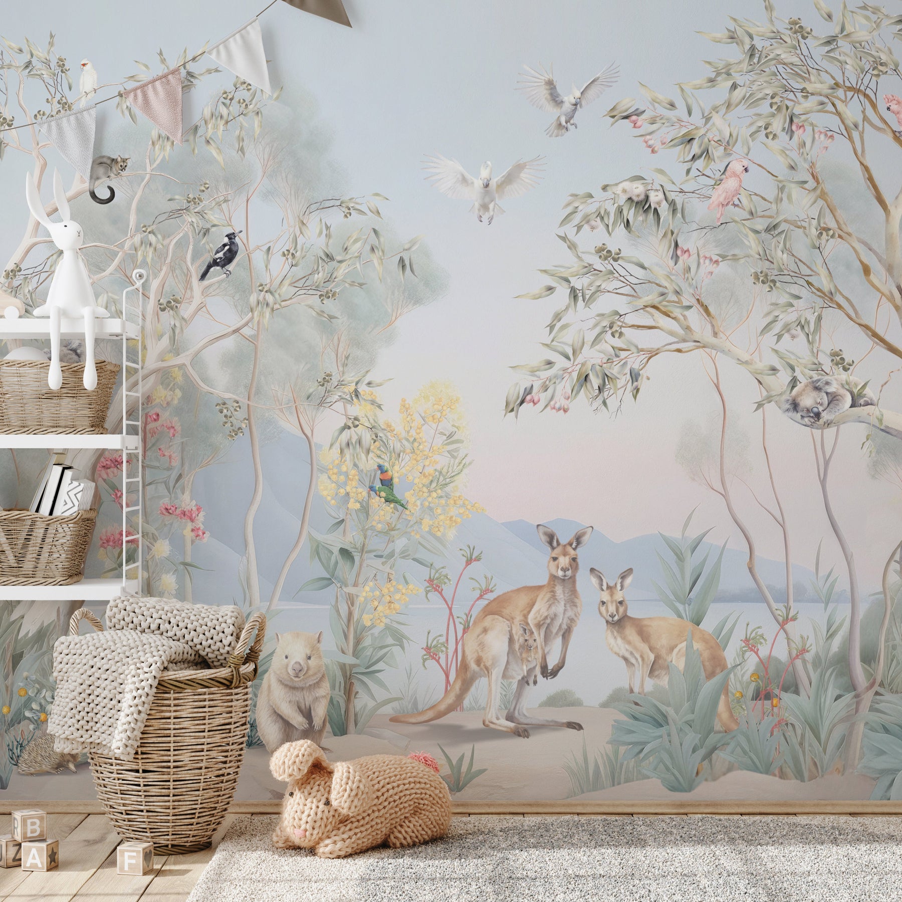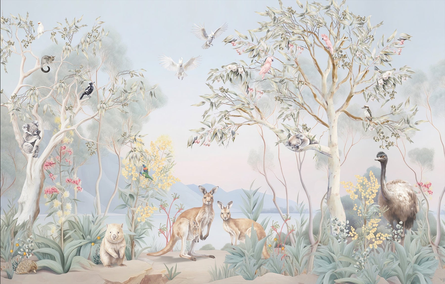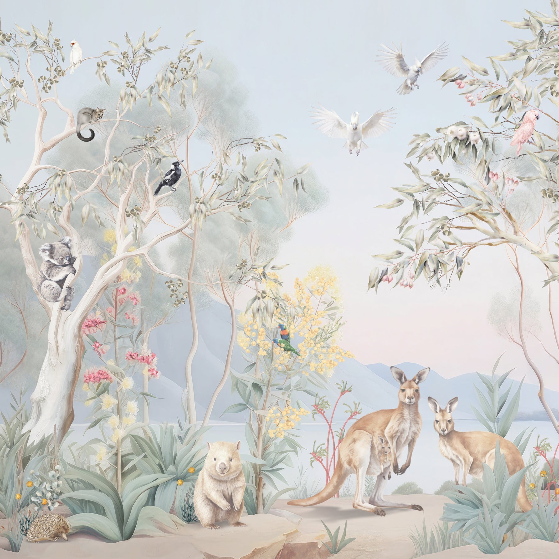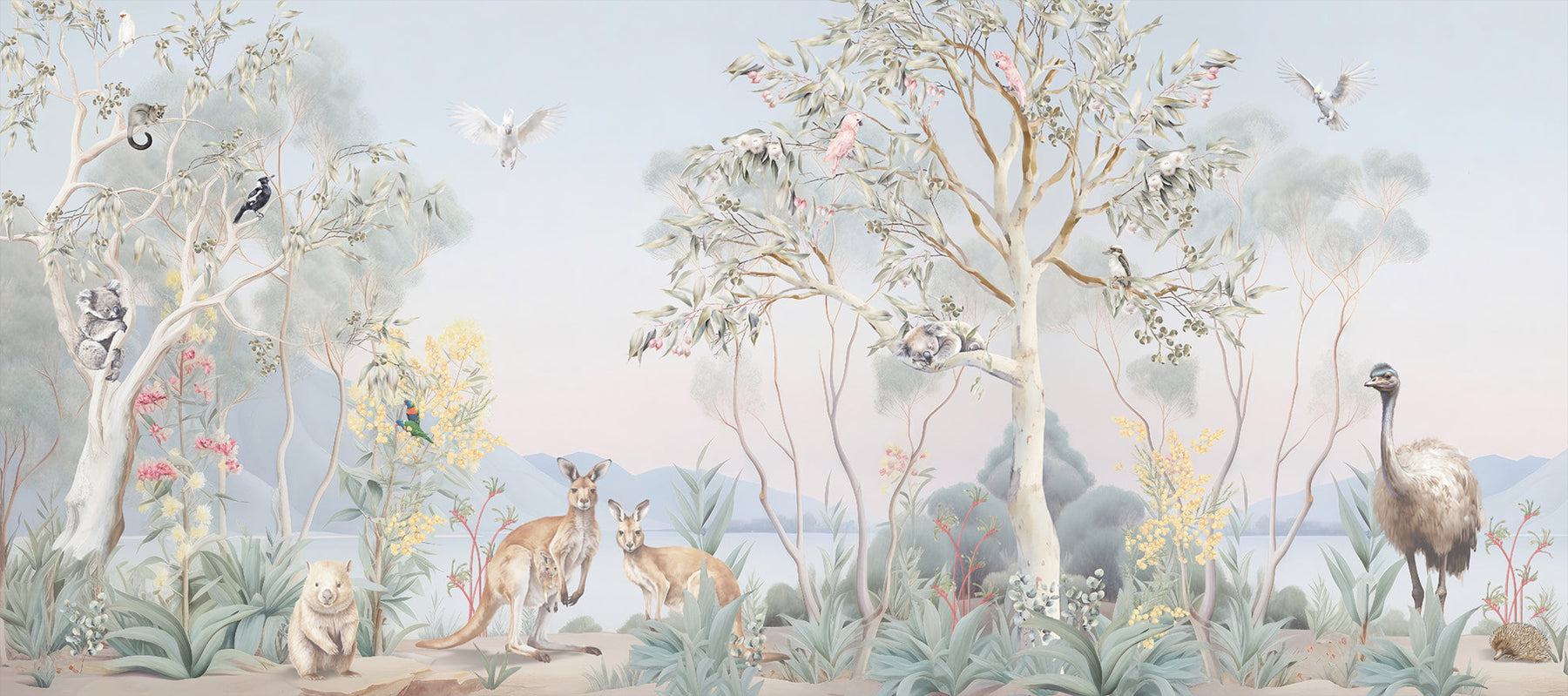 Under the shade of a coolabah tree...sits an Australian menagerie. Escape down under with this beautiful mural full of Australian flora and fauna. This picturesque mural with pretty sunrise hues features some of Australia's favourite mammals such as kangaroos, koalas, wombats, ring tail possums and echidnas. Sitting among the gum trees and wattle flowers there's an abundance of bird life too such as long billed corellas, magpies, emus, kookaburras, white and pink cockatoos and sweet lorikeets.