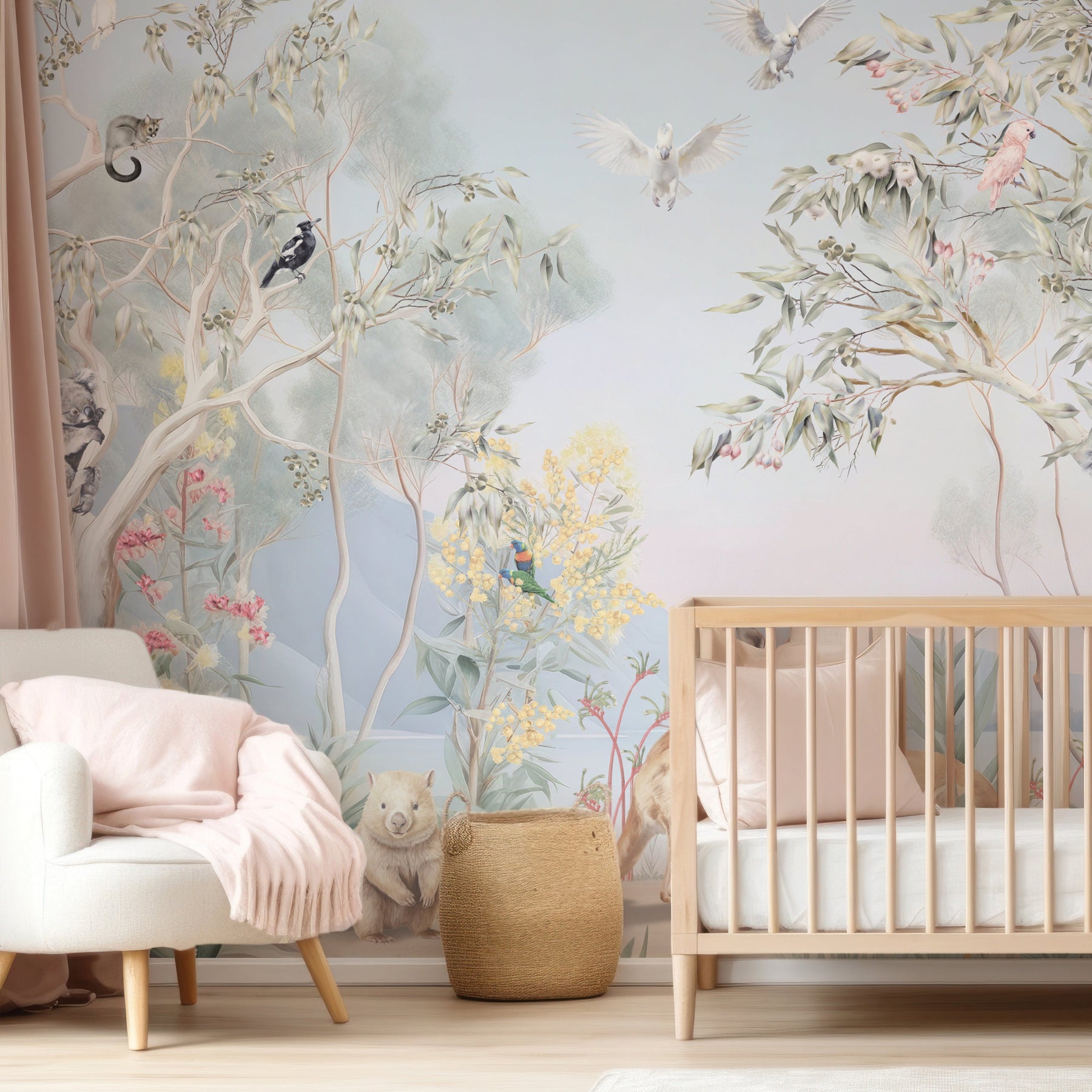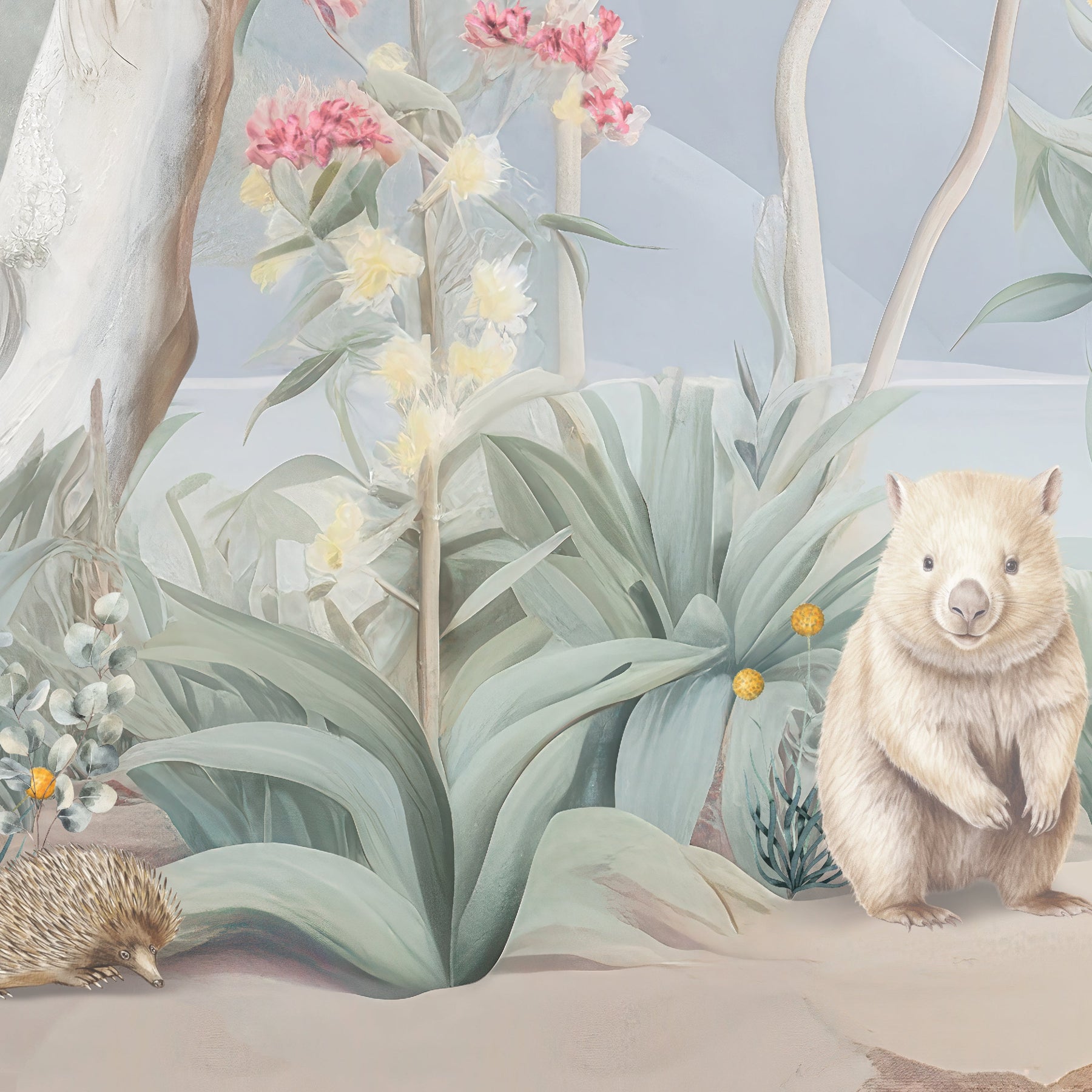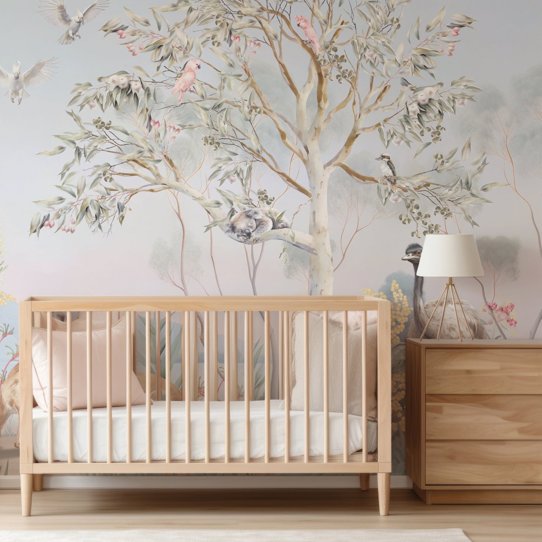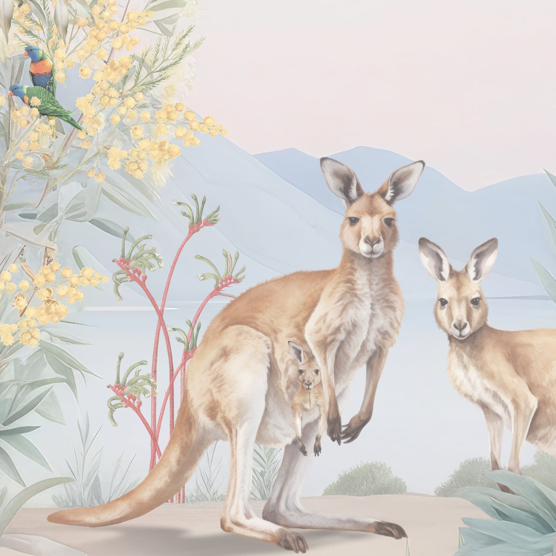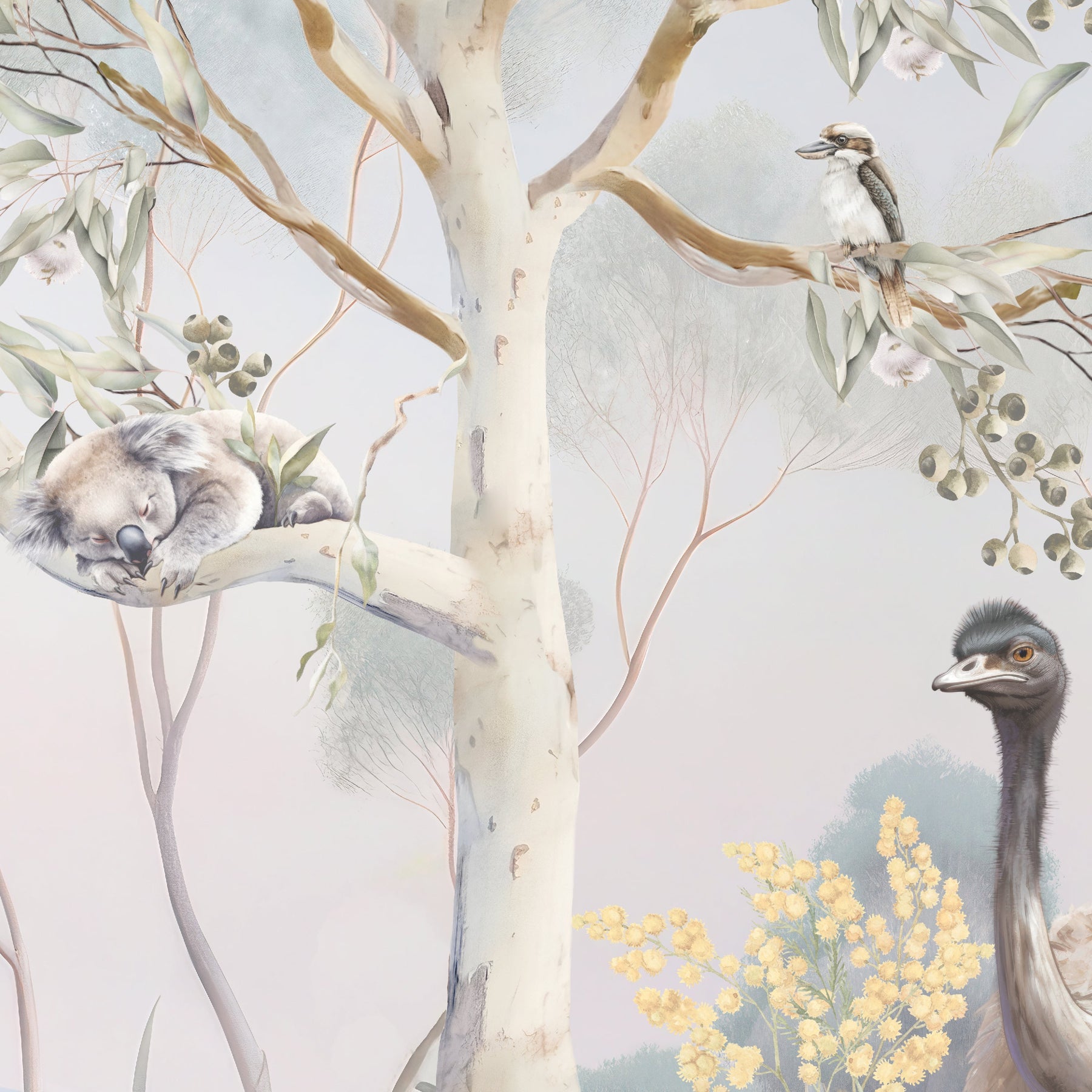 Under the shade of a coolabah tree...sits an Australian menagerie. Escape down under with this beautiful mural full of Australian flora and fauna. This picturesque mural with pretty sunrise hues features some of Australia's favourite mammals such as kangaroos, koalas, wombats, ring tail possums and echidnas. Sitting among the gum trees and wattle flowers there's an abundance of bird life too such as long billed corellas, magpies, emus, kookaburras, white and pink cockatoos and sweet lorikeets.