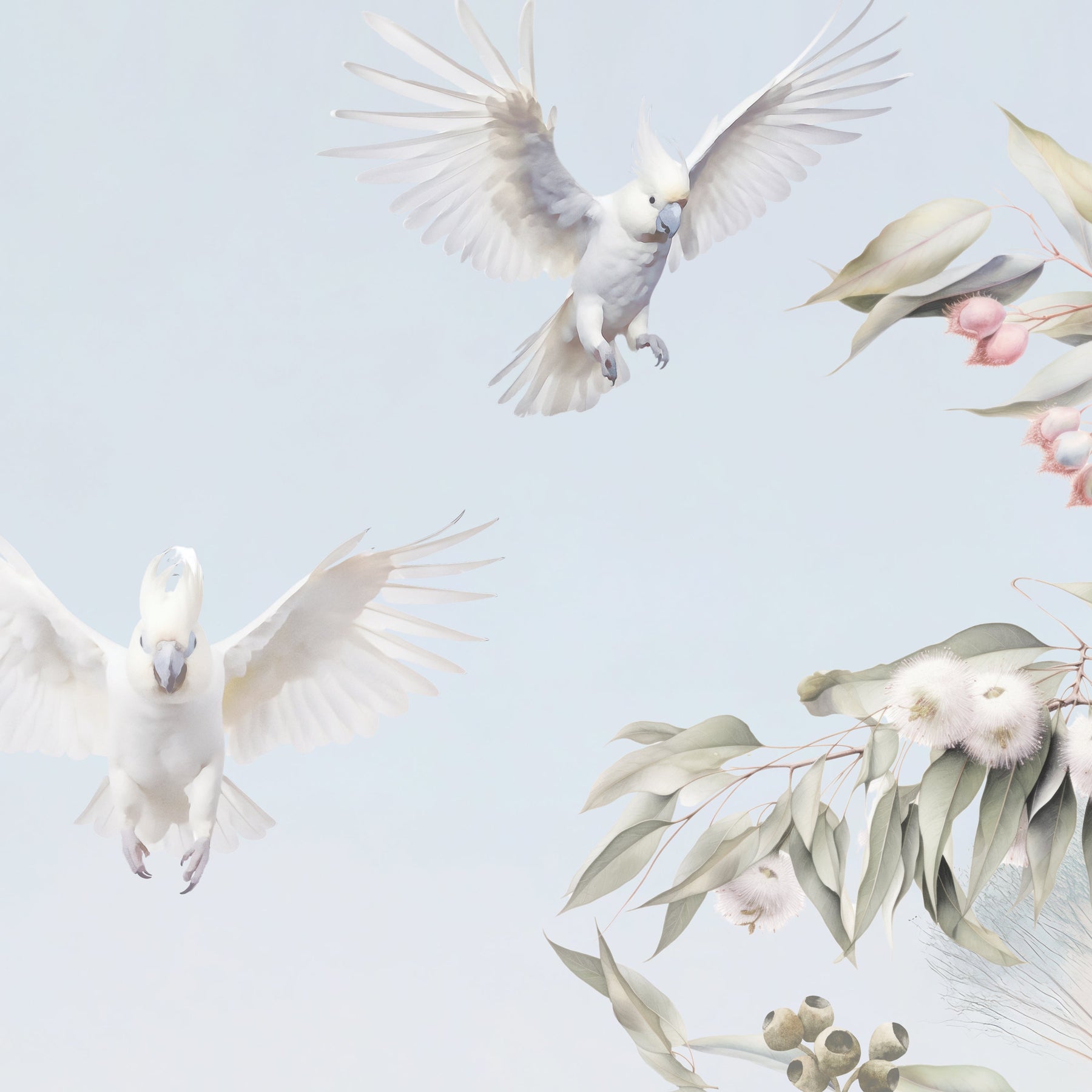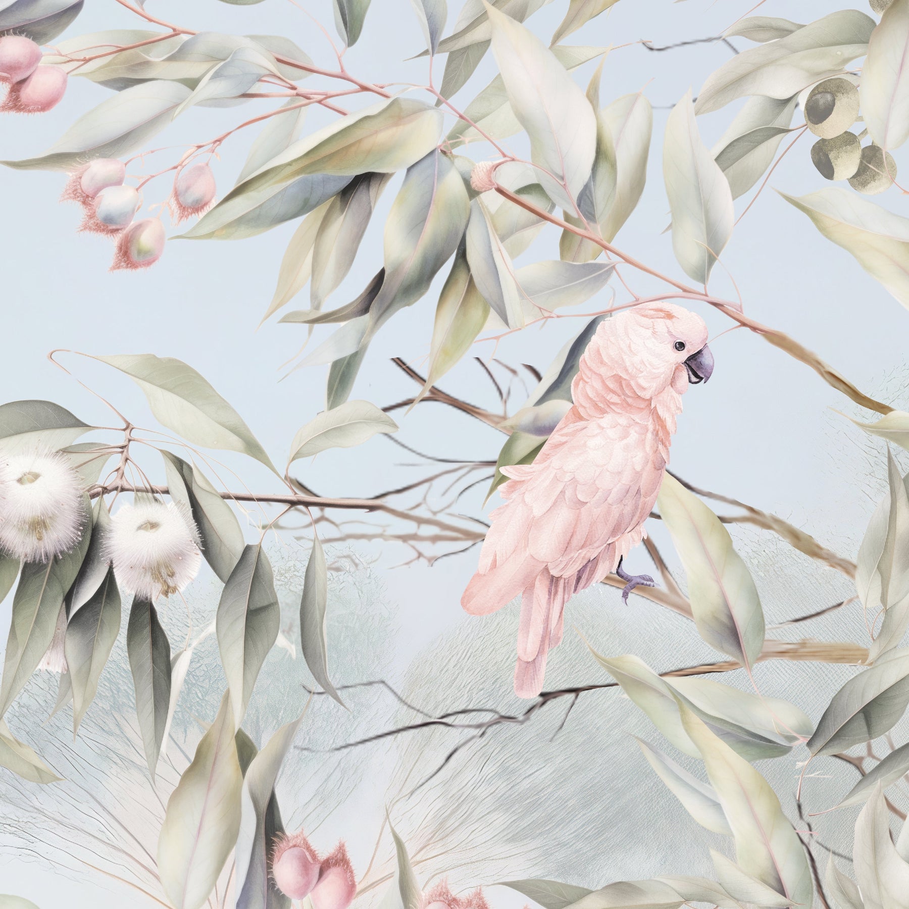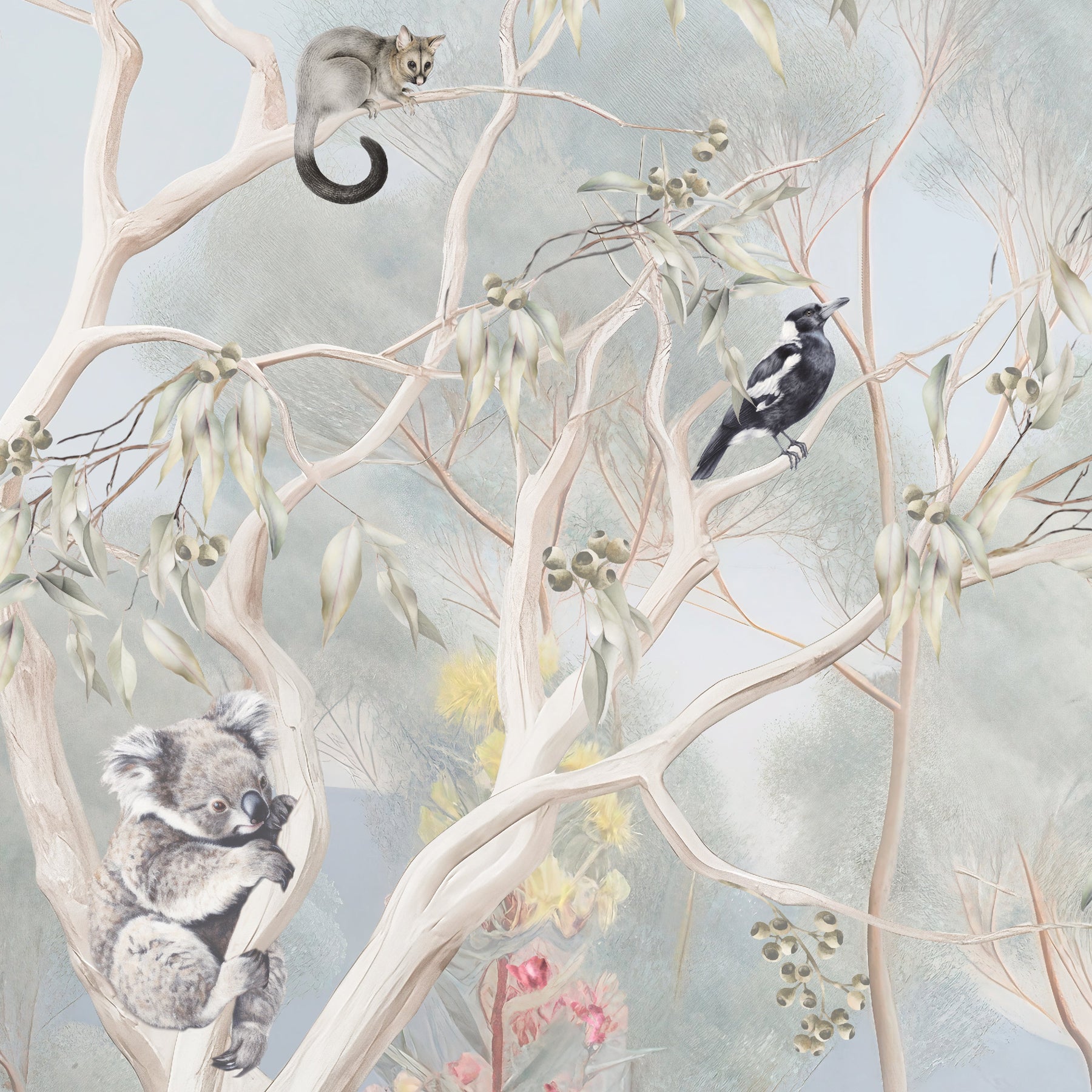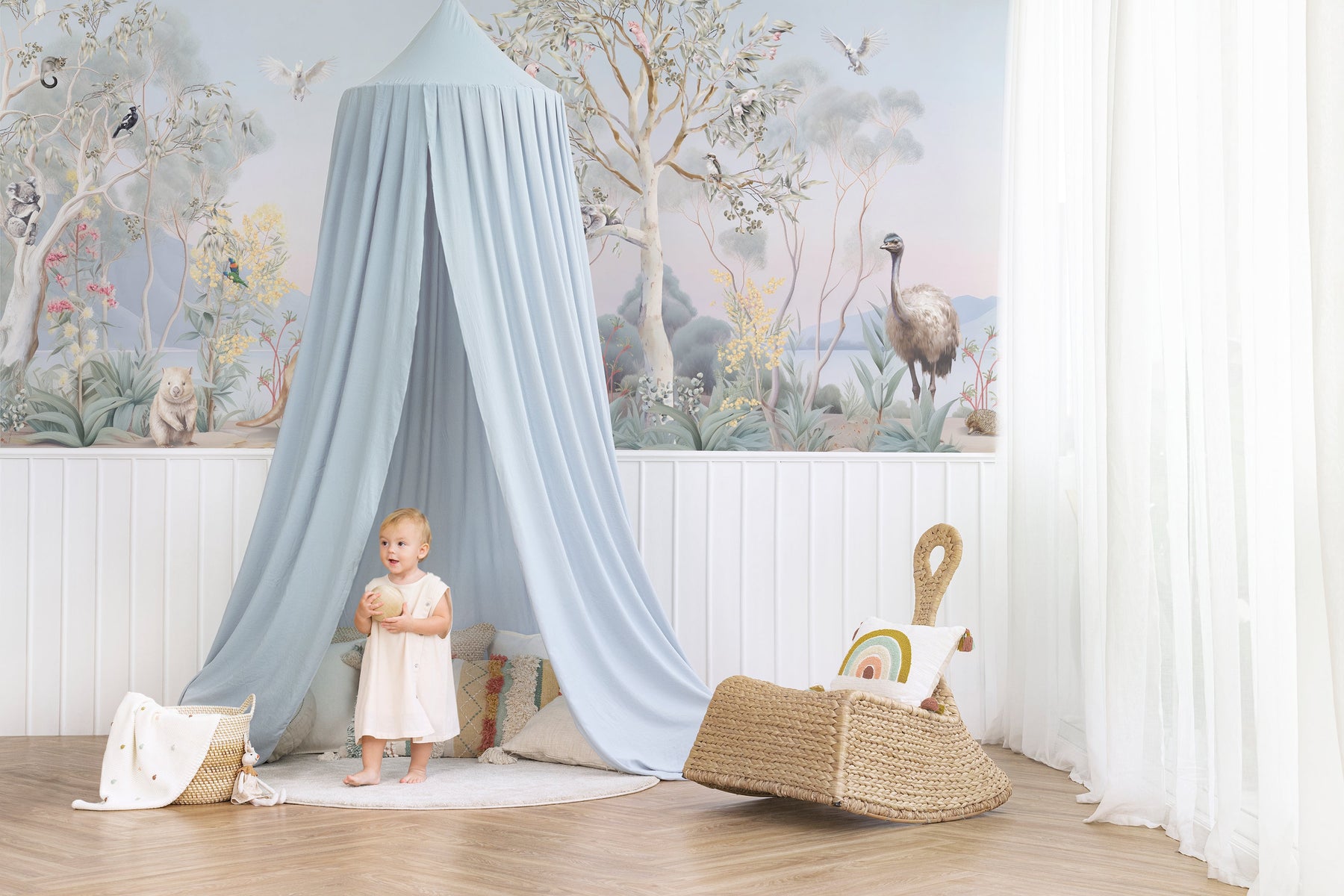 Under the shade of a coolabah tree...sits an Australian menagerie. Escape down under with this beautiful mural full of Australian flora and fauna. This picturesque mural with pretty sunrise hues features some of Australia's favourite mammals such as kangaroos, koalas, wombats, ring tail possums and echidnas. Sitting among the gum trees and wattle flowers there's an abundance of bird life too such as long billed corellas, magpies, emus, kookaburras, white and pink cockatoos and sweet lorikeets.