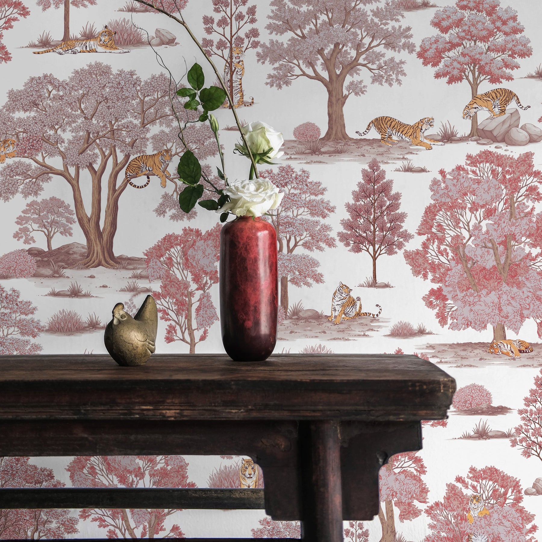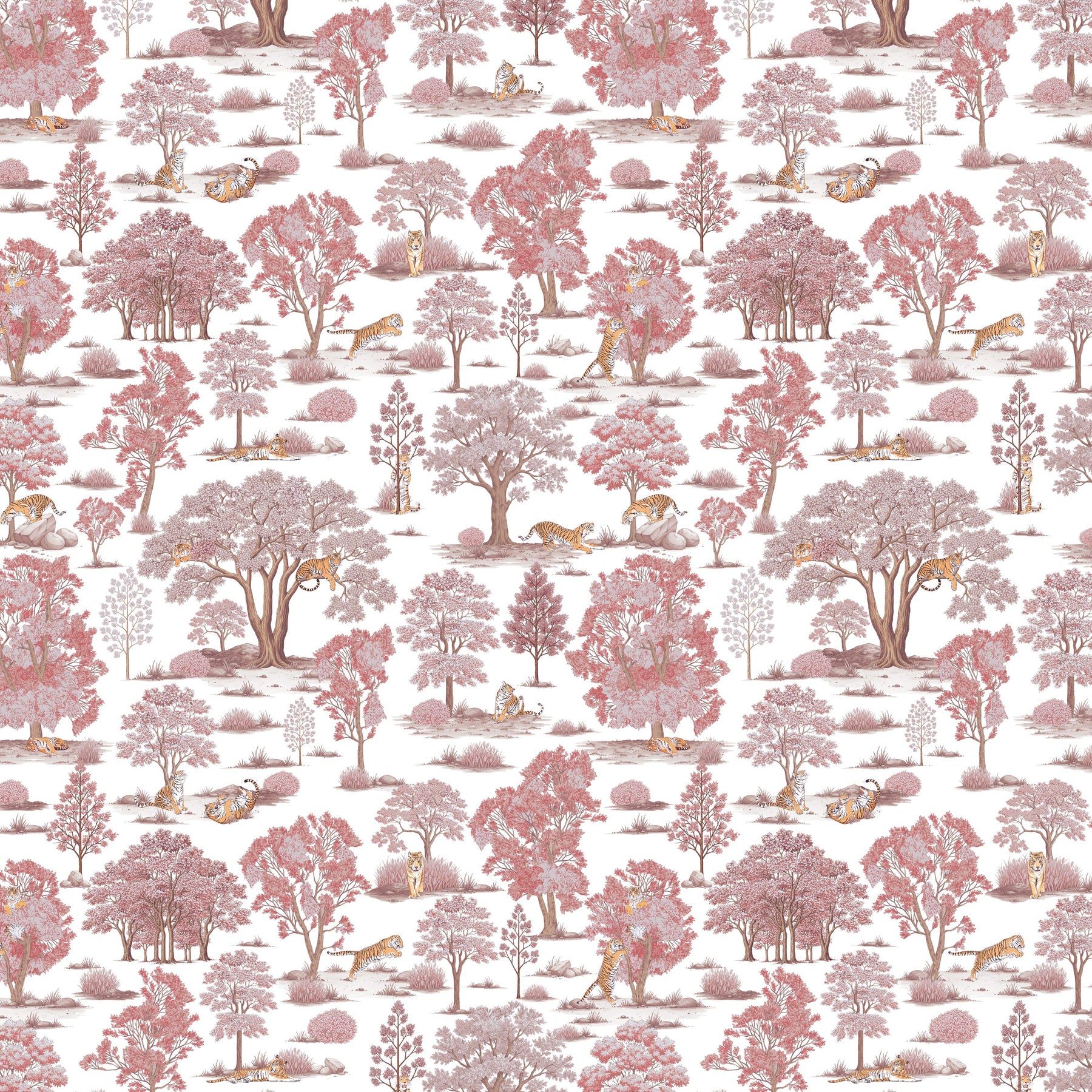 A playful, vintage style pattern featuring tigers frolicking, sleeping, hunting and climbing in the woods.