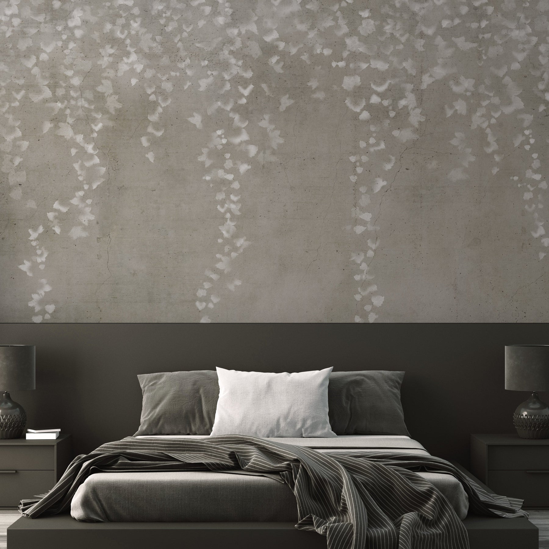 Scattered white and translucent leaves delicately cascading down a grungy taupe grey concrete wall, with hairline cracks.
