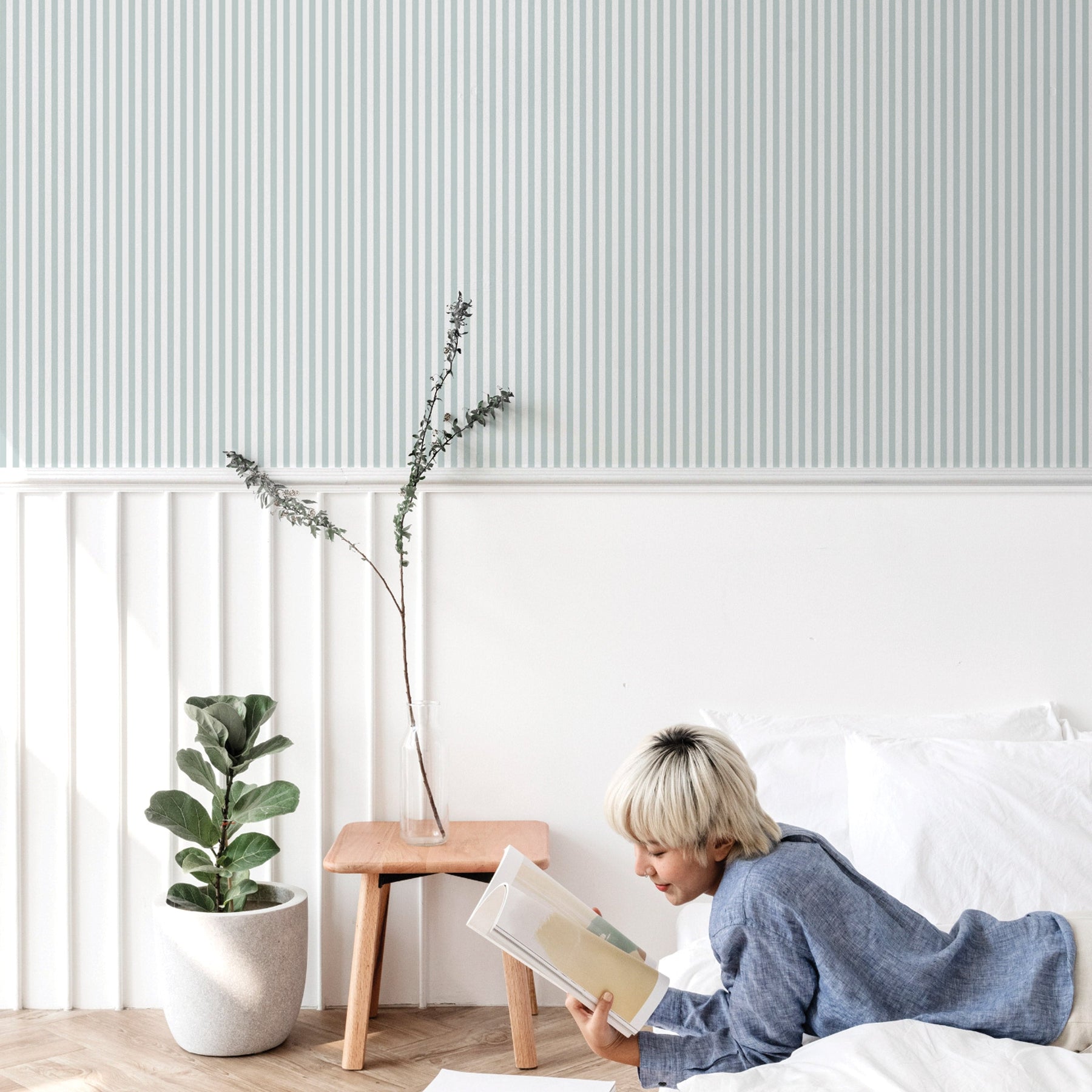 If you are matching whites in your room, ordering a sample is a must. Industrial printers do not print white ink. Instead a subtractive process is used and any white in the design is left blank and relies on the colour of the material. i.e. if the background is white, then the material’s natural white colour is used. A wallpaper's natural white varies from one material to another. If you have any queries regarding how white your preferred material is, ordering a sample on that material is extremely important before purchasing your final wallpaper.
