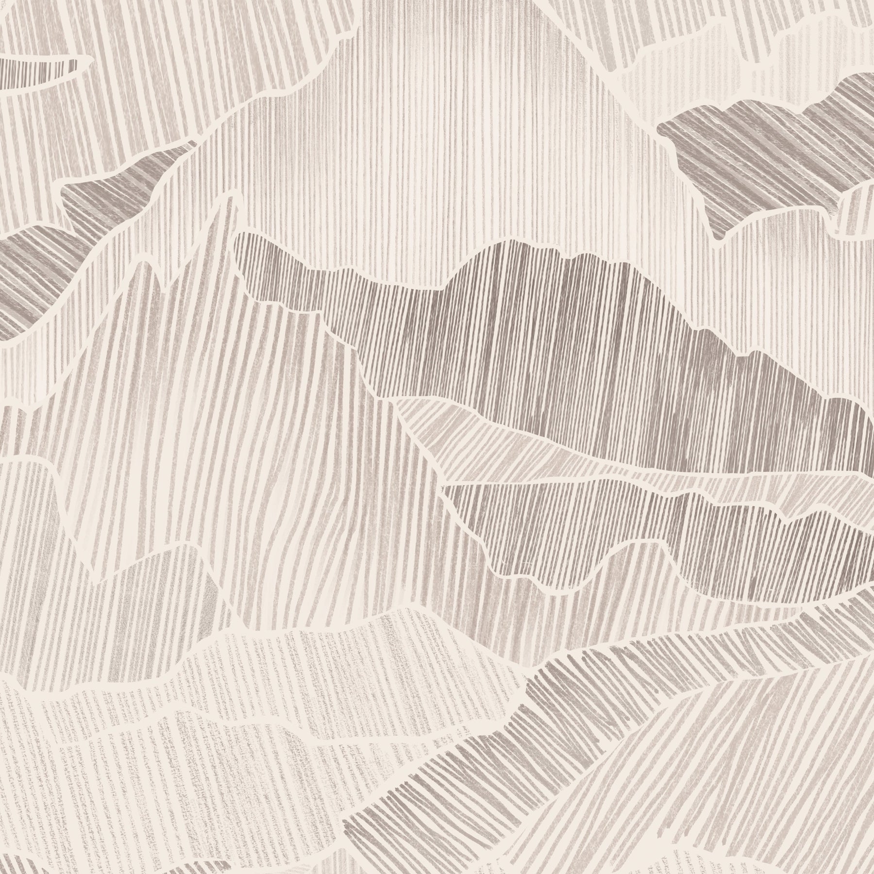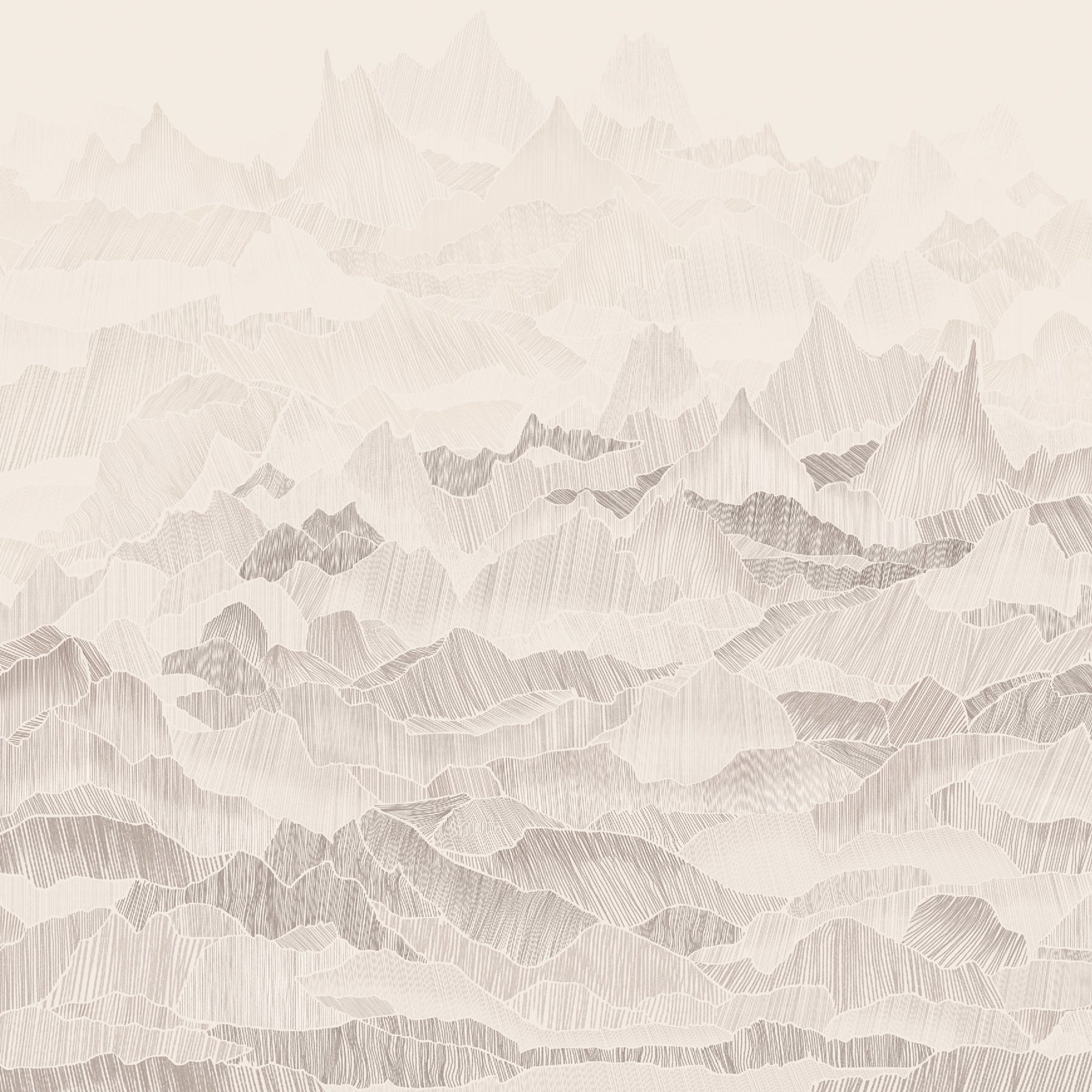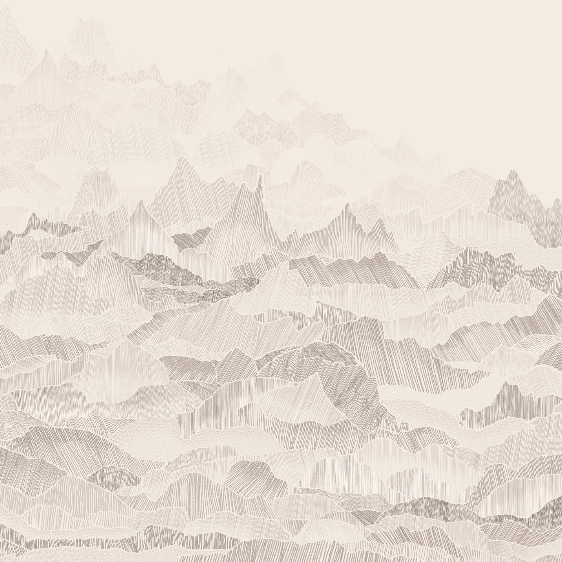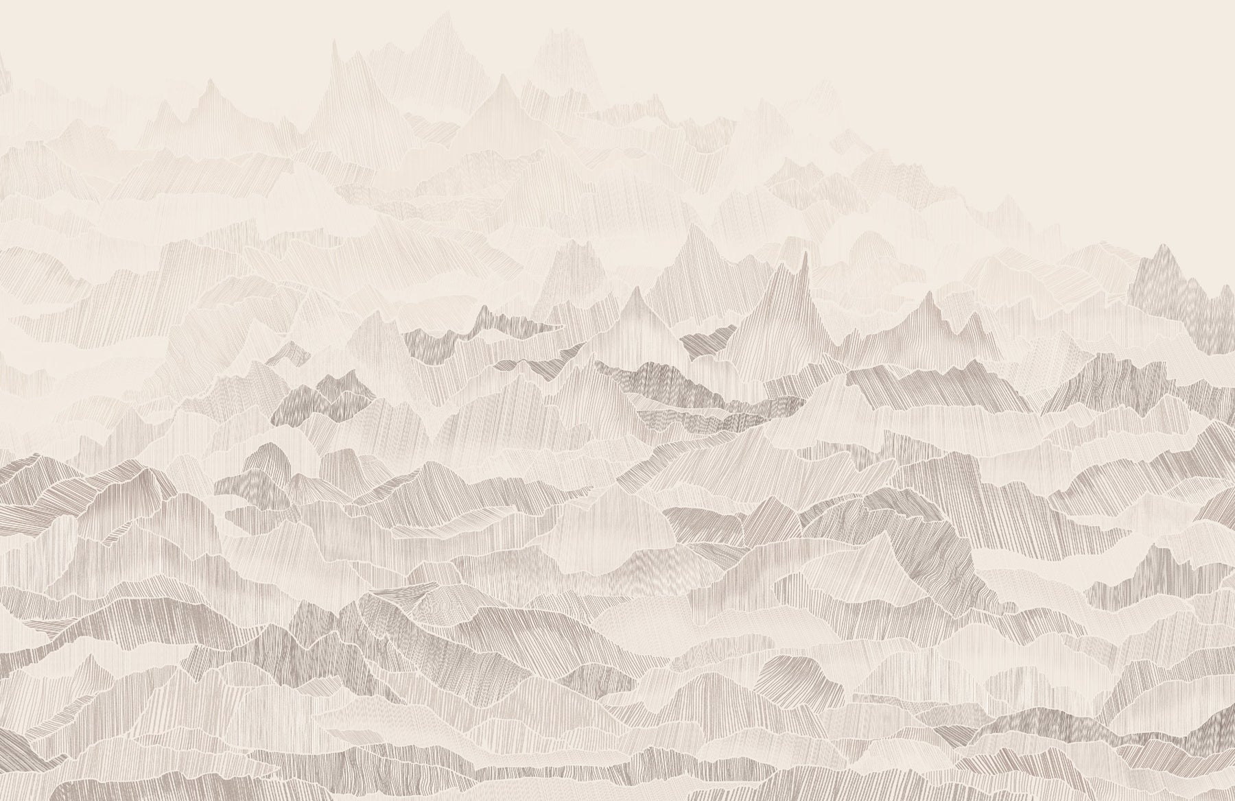 A hand drawn sketch of craggy, rugged mountains with soft and linear pencil strokes.