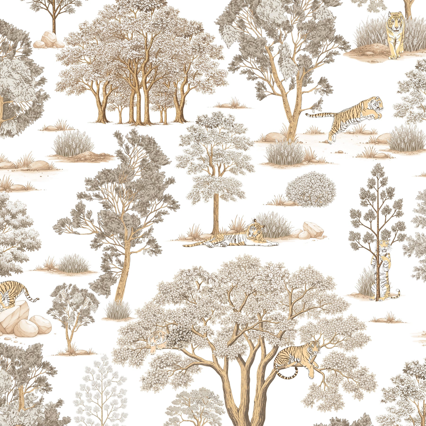 A playful, vintage style pattern featuring tigers frolicking, sleeping, hunting and climbing in the woods.