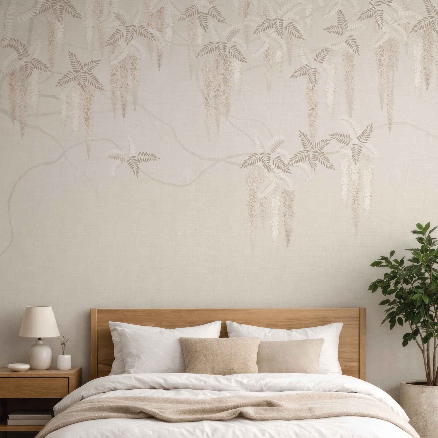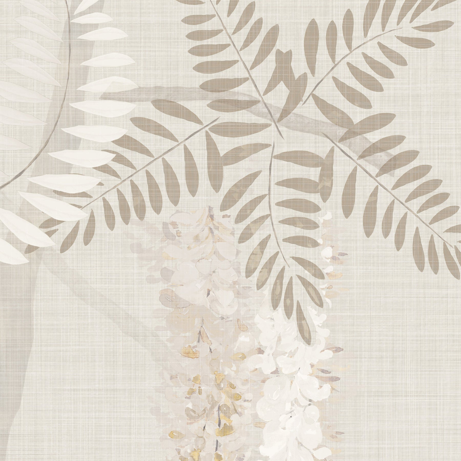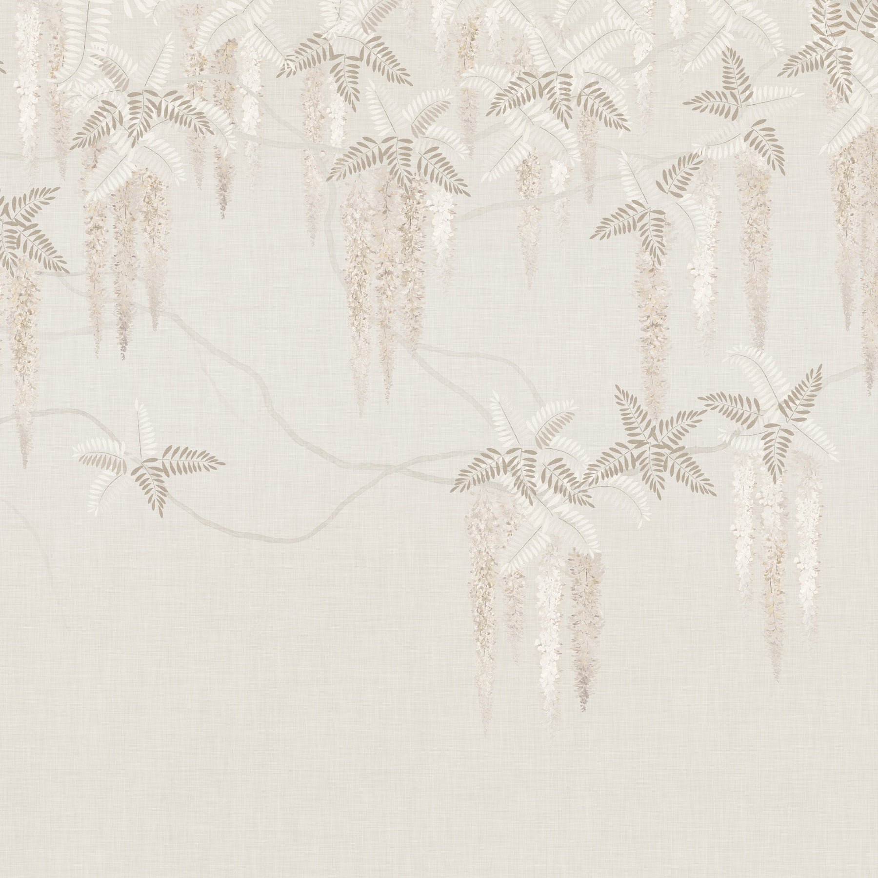 Beautiful watercolour wisteria in soft browns and creamy whites cascading over pale, twisted branches against a pale beige crosshatch backdrop. Different materials print cream coloured wallpaper differently so always order a sample in your preferred material to ensure you are happy with the colours.
